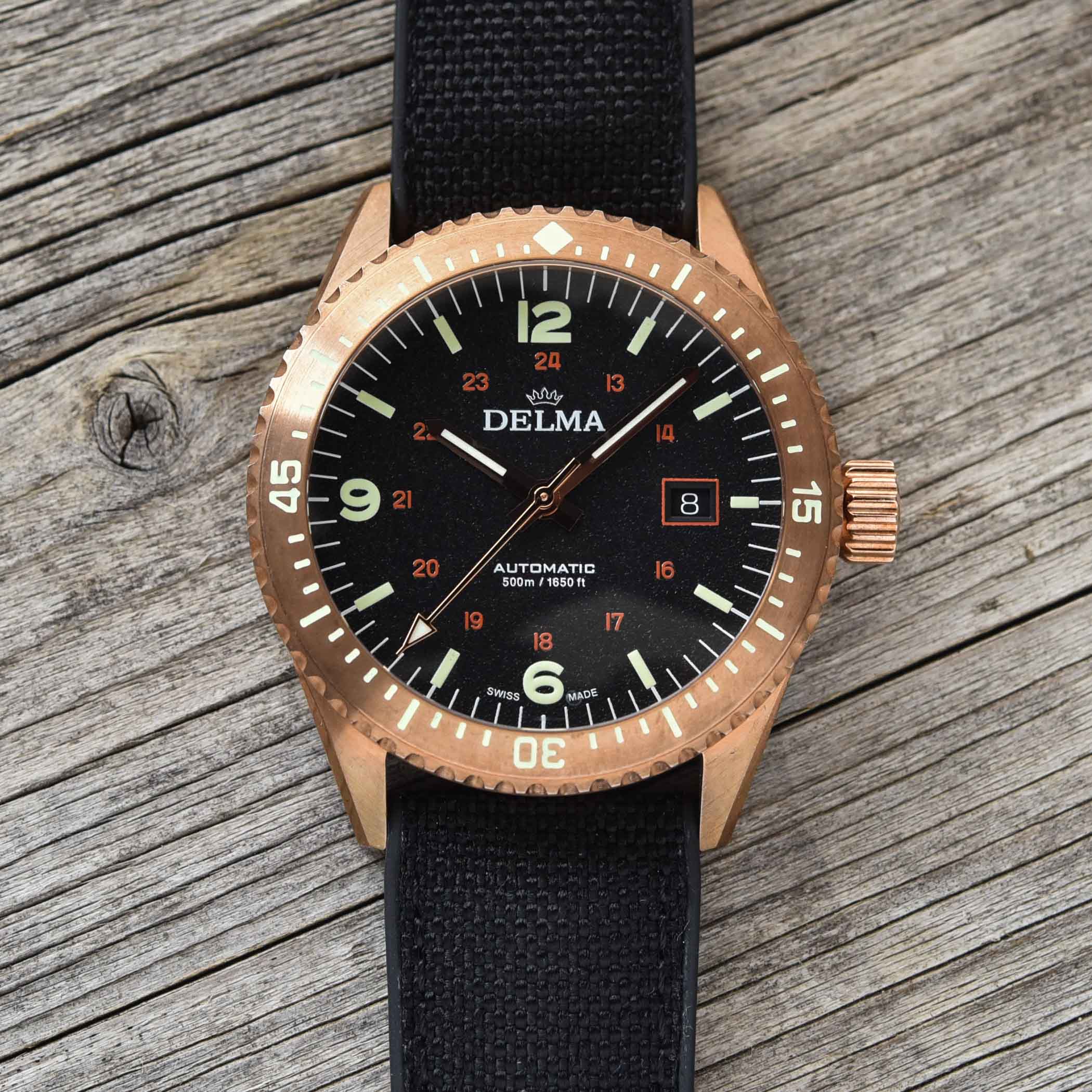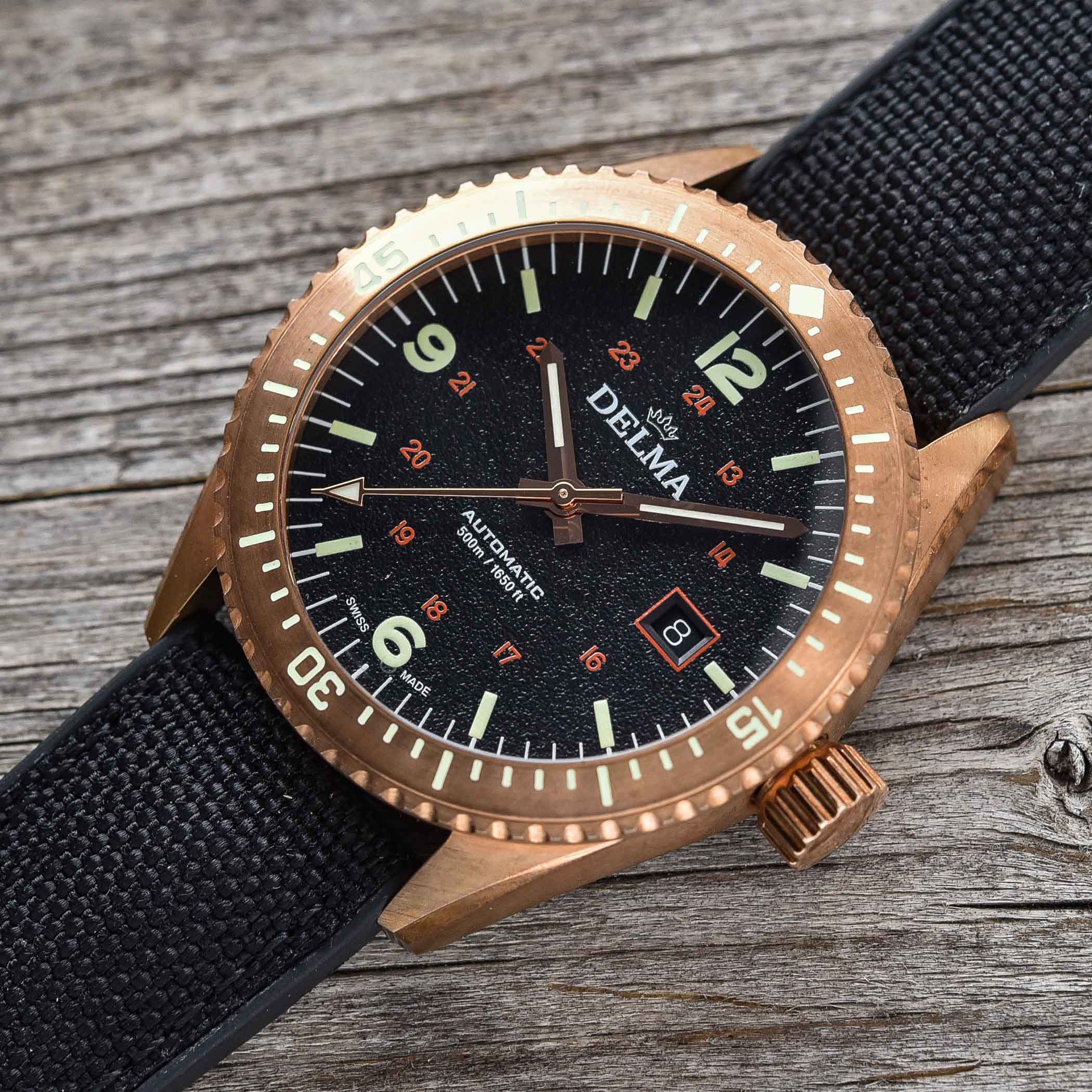 It’s common today for popular watch collections to have bronze options. Look no further than Hamilton’s Khaki Field Mechanical Bronze, Oris’ Big Crown Bronze Pointer Date or Tudor’s Black Bay Fifty-Eight Bronze. It usually just offers something aesthetically interesting, but in Delma’s case, it serves a dual purpose. As mentioned, bronze is very resistant to salt water and the Cayman can descend to 500 metres. That said, its bronze outfit looks very cool and as a field-focused watch, the majority of wearers will likely remain landside. The case isn’t exactly compact at 42mm in diameter and 13.3mm in height, but this particular model isn’t a skin diver per se, so I’ll let it slide. It wears well on the wrist and the size is ideal for both field and underwater work. The bronze used is CUSN6, which has less tin than standard bronze (6% tin vs 12%) and is ideal for high corrosive environments. Of course, the stainless steel models are fine in seawater, but do they look as cool? I don’t think so (your mileage may vary).