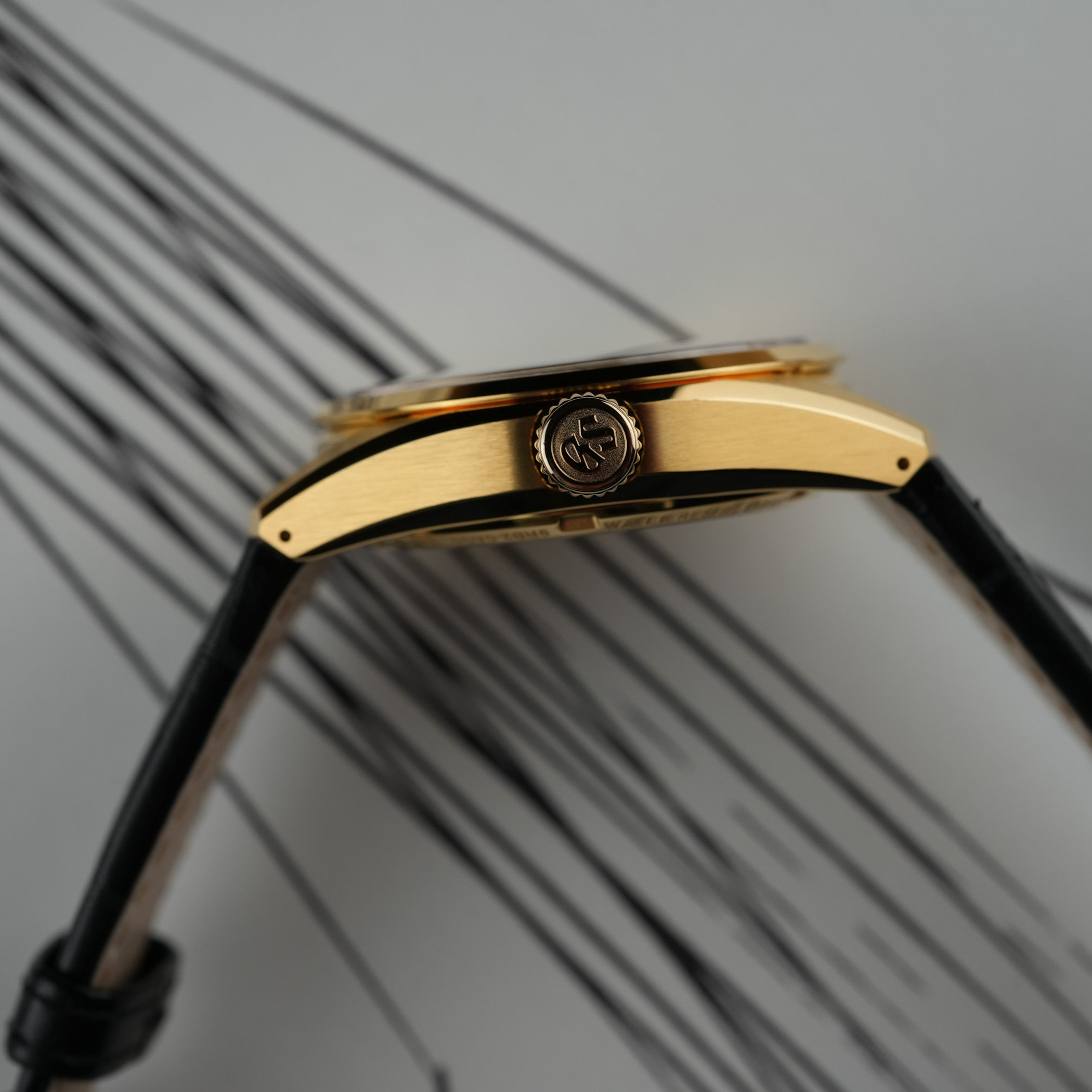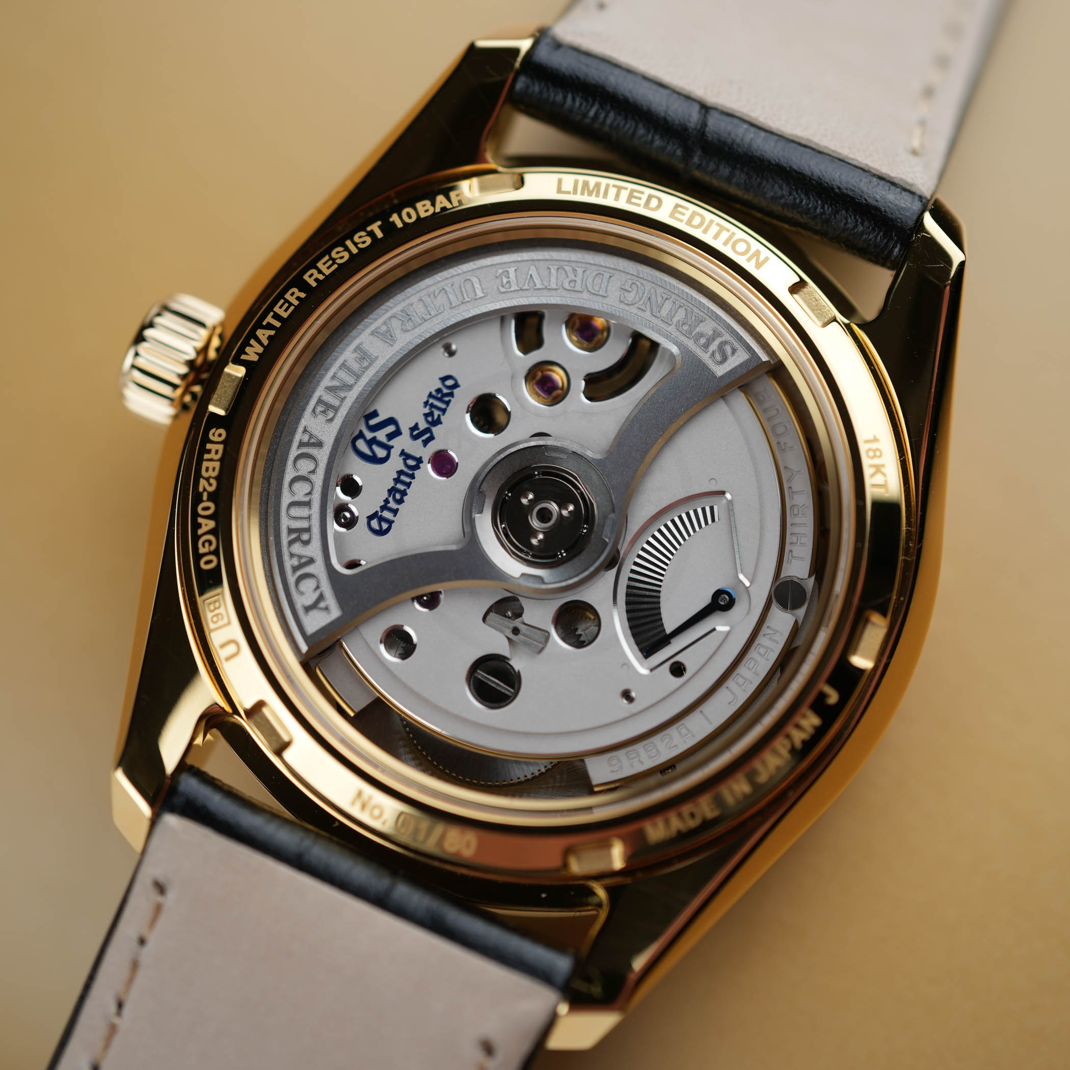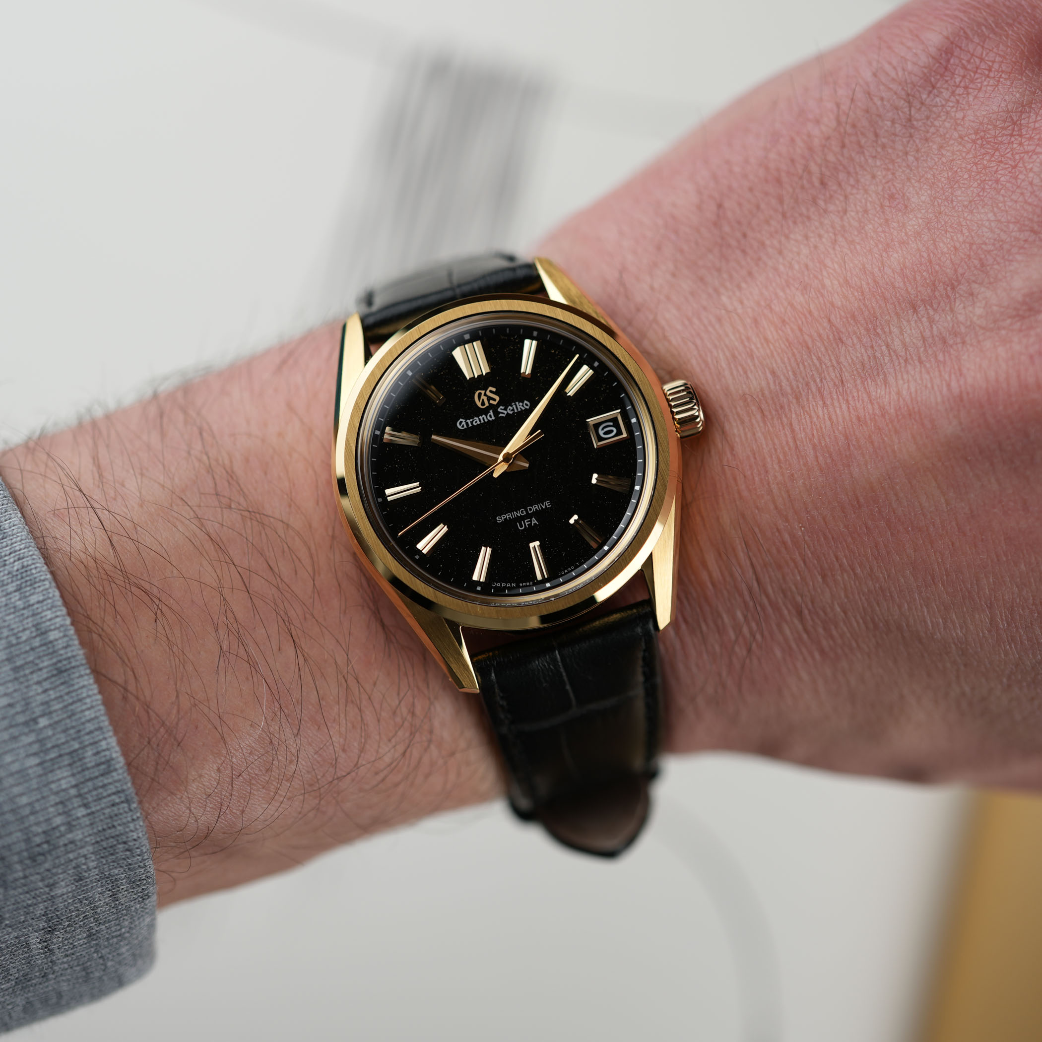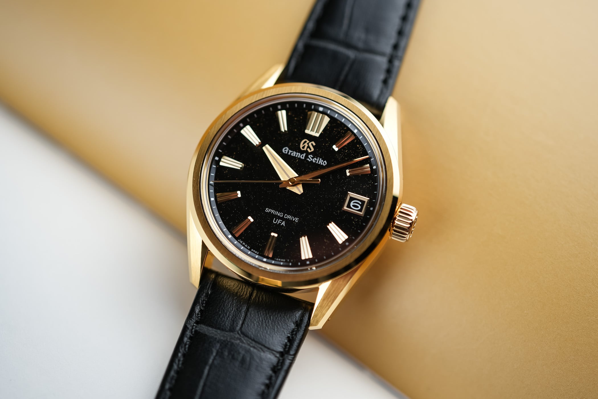 This brings us to the second key acronym that made headlines last year. U.F.A., which stands for Ultra Fine Accuracy, refers to its new-generation Calibre 9RB2, with its unprecedented ±20 seconds per year (±3 seconds per month) accuracy. A first for the Evolution 9 collection, the 37mm case is crafted in 18k yellow gold and finished in accordance with the collection’s design mandates. Fitted with a box-shaped sapphire crystal, a screwed caseback with a see-through sapphire, and a comfortable 100m water resistance, the case has a reasonable 11.4mm thickness, which translates to dress watch territory at Grand Seiko.