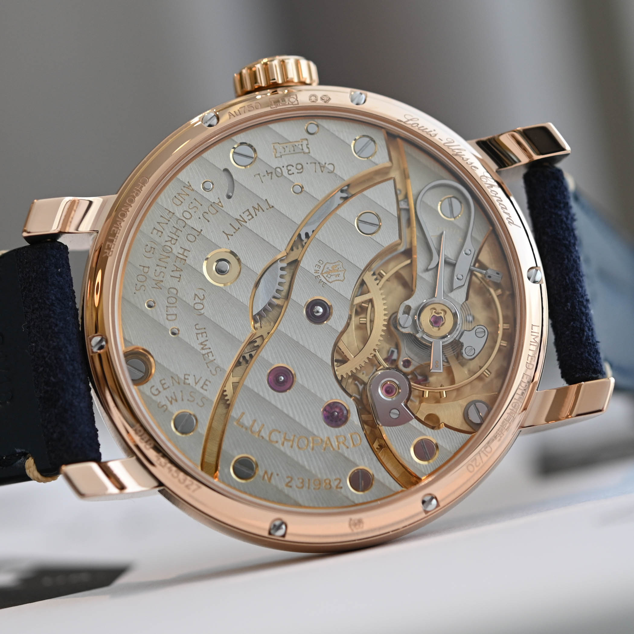 The gorgeous 38mm wide and 6.7mm thick manual-winding L.U.C 63.04-L calibre fills the case, offering a delightful mechanical spectacle. Decorated with haute horlogerie finishings that have earned it the coveted Poinçon de Genève hallmark, the German silver bridges (aka nickel silver or maillechort) and mainplate retain the natural silvery hue of this metal but reveal refined hand-bevelled and gilded edges. Other top-notch finishings include the gilded inscriptions and traditional Côtes de Genève and perlage. The COSC chronometer-certified movement features an elegant swan-neck regulator. It beats at 2.5Hz, delivers a 60-hour power reserve and has a stop-seconds function.