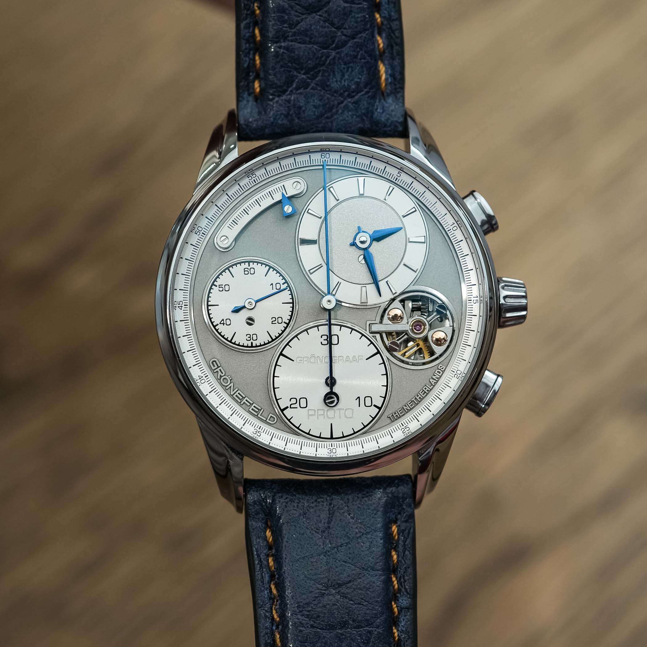 Further left and down, at 9’o clock, there is a running seconds subdial, with the chronograph’s 30-minute counter with a Breguet-style hand at 6 o’clock. Strikingly blue chronograph central hand dominates the stainless steel base with rhodium-plated sub-dials and elements decorated with frosted and satin-grained finishes. The Grönefeld text logo and “The Netherlands” mark the watch’s origin, and the Grönograaf name appears on the 30-minute counter’s upper part, with the limited edition number stated at the bottom. The raised ring of the minutes and seconds track on the dial’s periphery ensures every second counts. Domed sapphire crystal with antireflective coating on both sides will protect from glare, and the case construction will protect from water getting in at 3 ATMs.