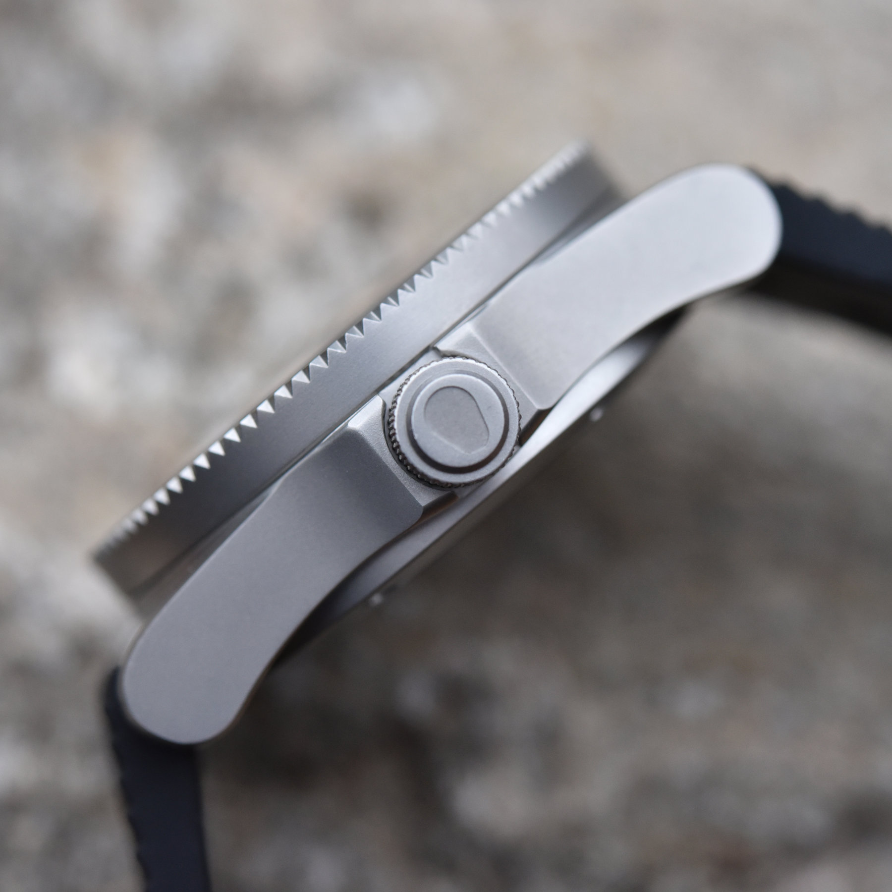 It has a stout middle case with well-rounded lugs and a very prominent bezel on top. This rotates one way only (counter-clockwise, obviously) and is fitted with a glossy black insert with a beige diving scale. The zero marker is Isotope’s signature Lacrima (teardrop) logo, tying it in with previous collections such as the Old Radium Bronze Tobacco Pilot’s Watch. This is also found on the crown and the caseback. The screw-down crown has two subtle guards that protrude from the caseband, and the water-resistance rating is 300m.