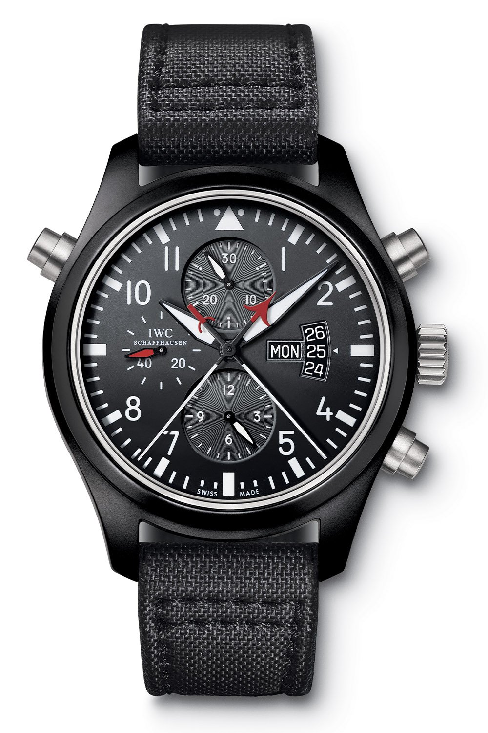 Introduced in 2007 with the Pilot’s Watch Double Chronograph Edition Top Gun IW379901, and then moved to a dedicated sub-collection in 2012 with for instance the Big Pilot Black Ceramic IW501901, the TOP GUN series relies on high-tech materials (classic ceramic but also for a couple of year Ceratanium) and military stealth technology styling. It is the most contemporary of all the pilot’s watches at IWC.