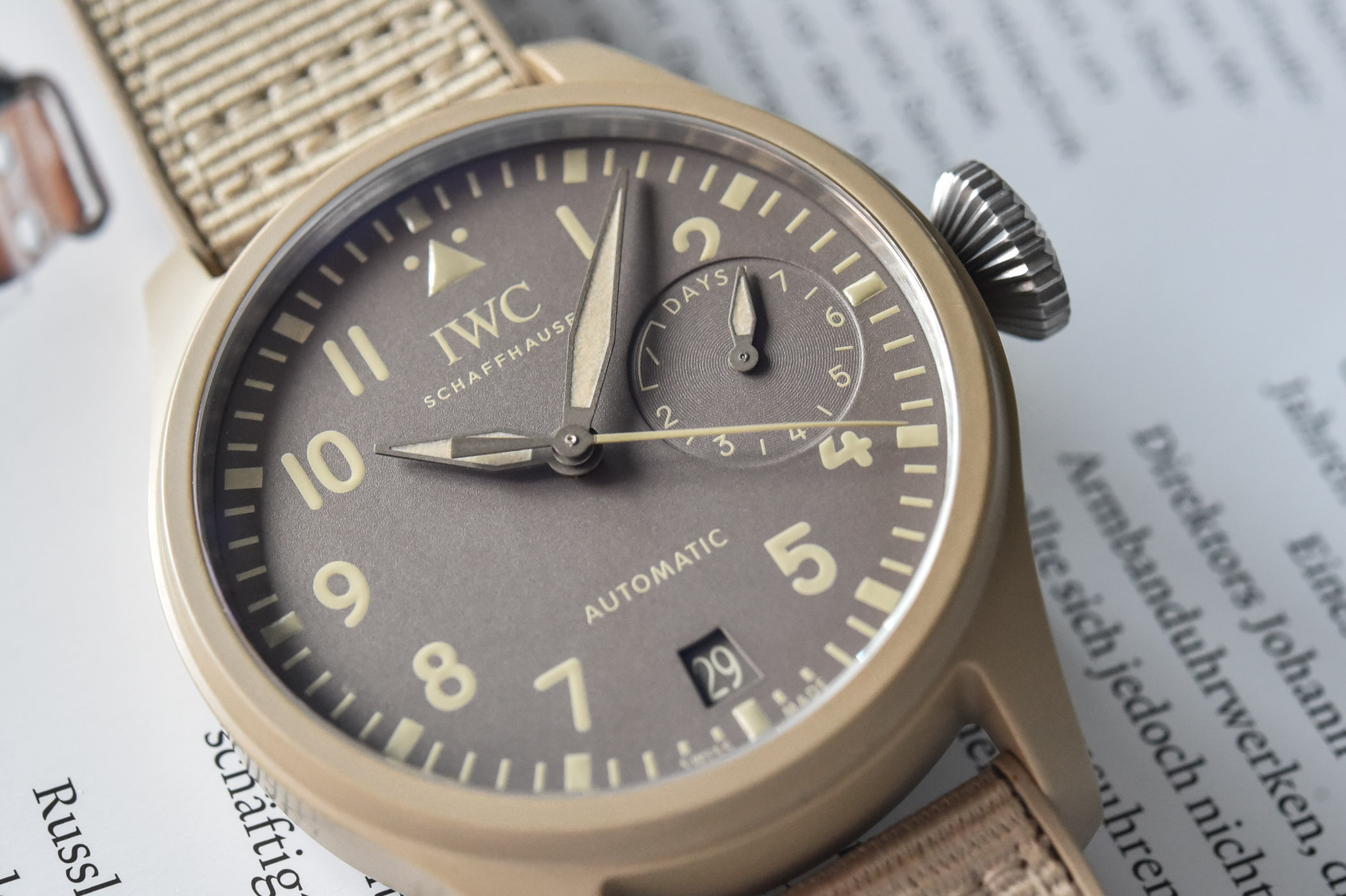 During the digital edition of Watches & Wonders 2021, IWC presented two Big Pilot’s models in sand-coloured ceramic cases: the Big Pilot’s Watch TOP GUN “Mojave Desert” as well as a more complicated Perpetual Calendar model, which we covered in April. The Mojave Desert sand-coloured ceramic case theme took off in 2019 with a Pilot’s Watch Chronograph TOP GUN. Although the TOP GUN family has always favoured black ceramic cases, these two new references mark the first time IWC uses sand-coloured ceramic on a Big Pilot’s watch. We spent some hands-on time with the automatic model (Ref. IW506003), and this is what we found.
