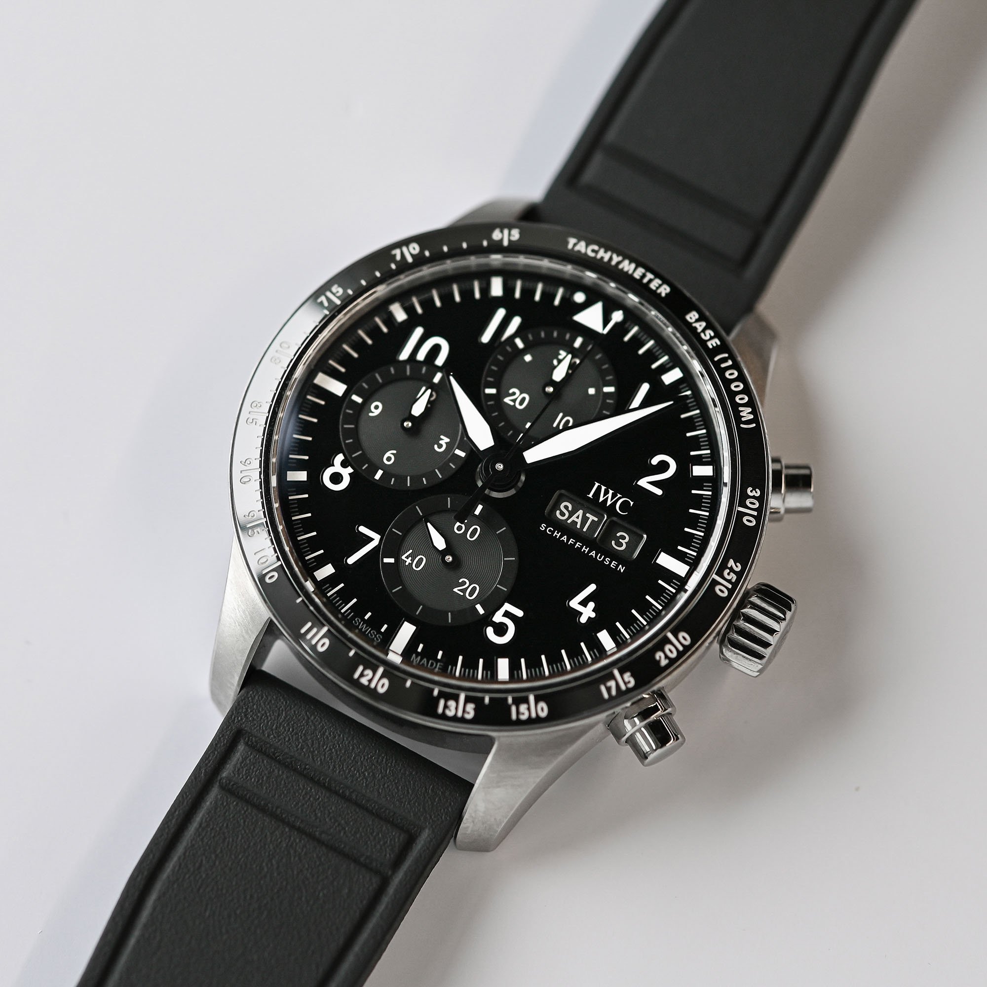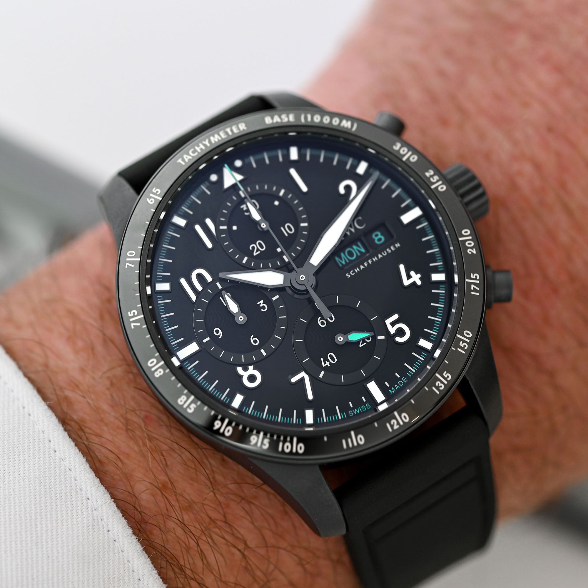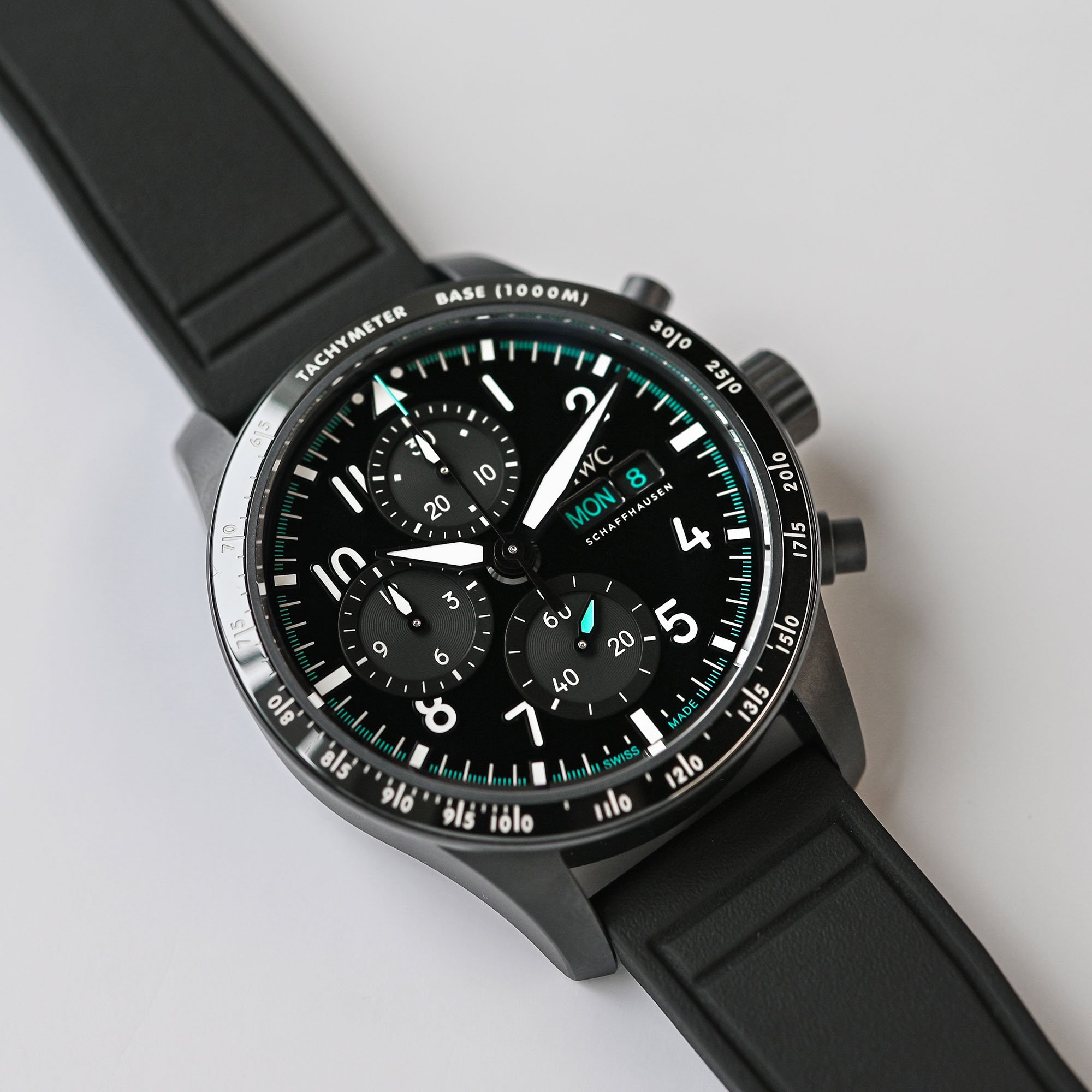 The fixed, polished black tachymeter ceramic bezel adds a distinct touch, emphasising its racetrack-ready purpose – and despite sharing most characteristics with a standard Pilot’s Watch Chronograph 41, this bezel changes everything. Indeed, this alteration gives the otherwise familiar airforce-inspired instrument-like design a significantly different appearance and also makes these watches wear slightly larger than this diameter suggests.