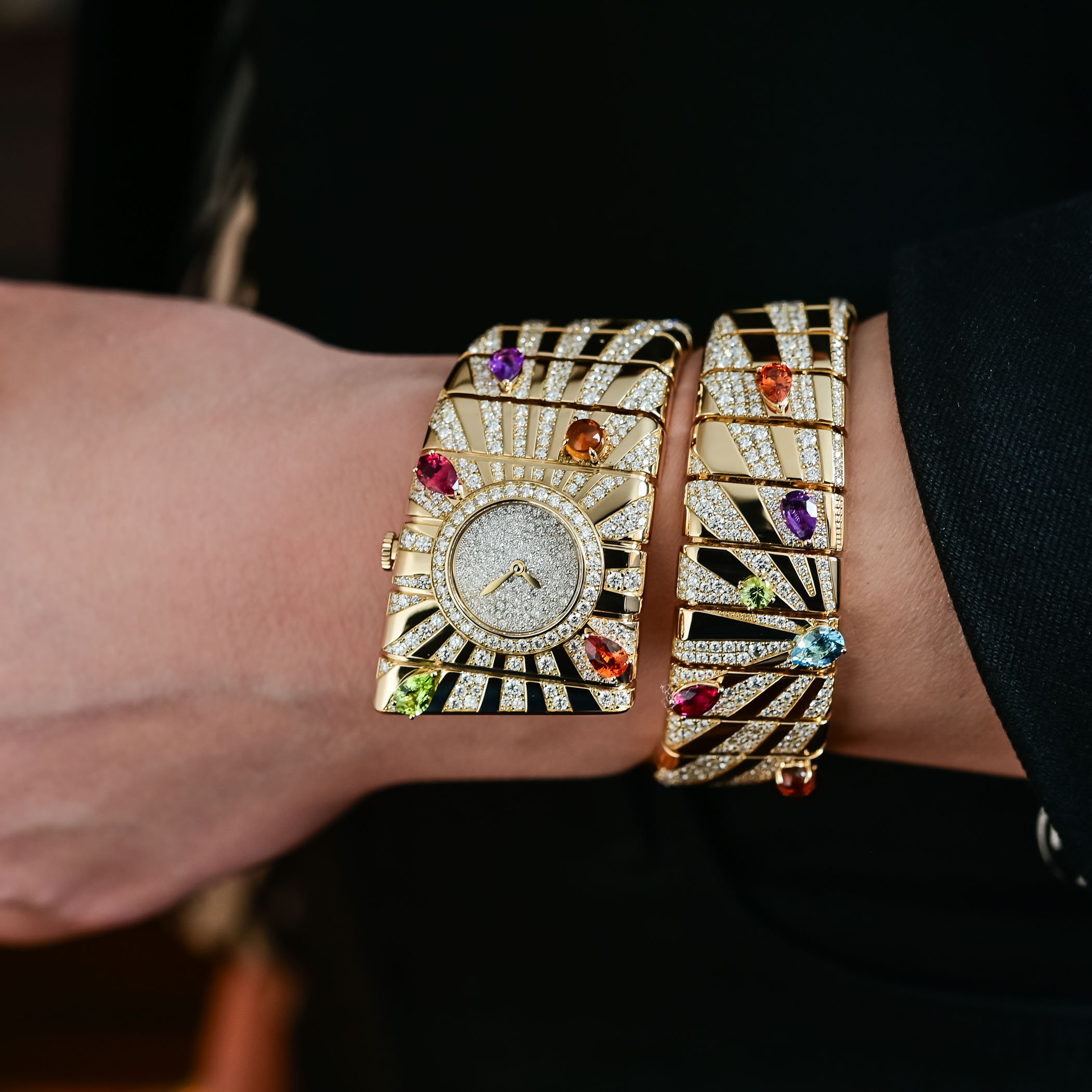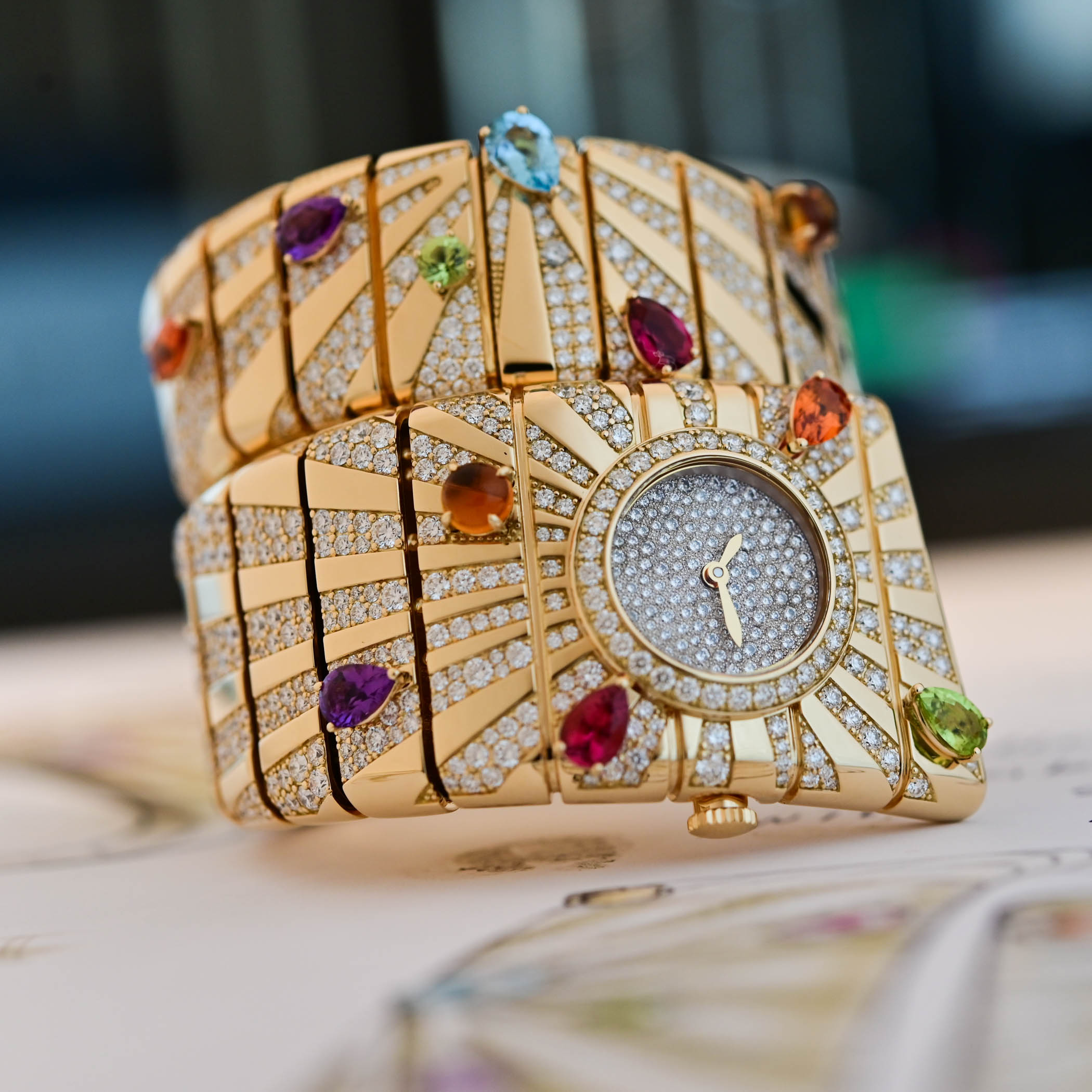 The 135mm-long yellow gold Tubogas bracelet is fitted with a small round dial and set with a vibrant palette of gemstones and diamonds. Radiating from the pavé diamond dial are a series of pavé sunbeams engraved into the gold cuff. In true Bulgari style, the mouthwatering colours of the cuff are provided by an assortment of coloured gemstones. Using citrines, rubellites, peridots, amethysts, topazes, and spessartites, the richly coloured gemstones feature different cuts, including Bulgari’s classic smooth cabochon cuts, as well as pear- and round-cut stones.