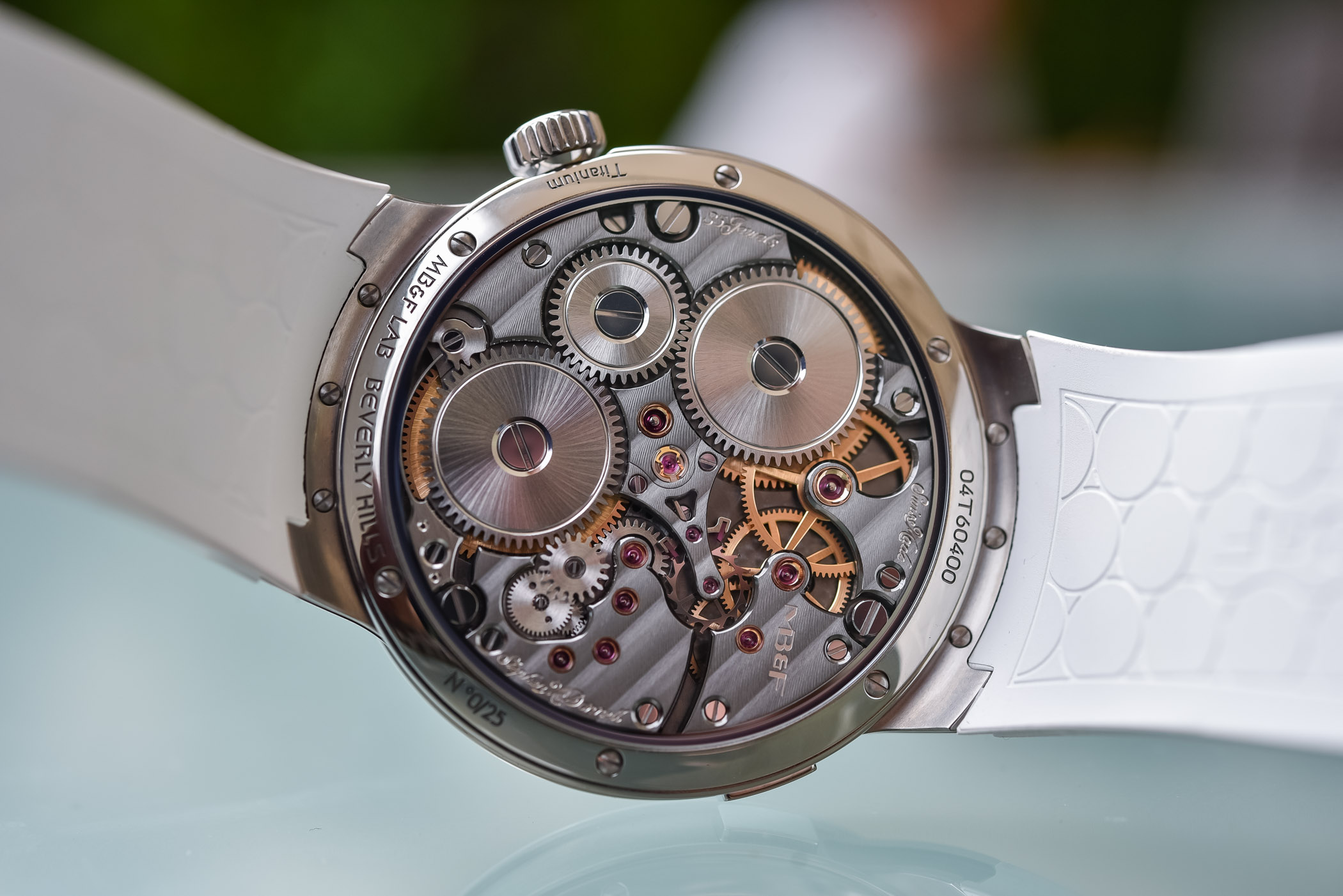One of the new editions, with an attractive “Icy Cool” dial and slate grey sub-dials, will become a serial production. The second, with a black base dial and dark blue sub-dials, is a limited edition of 25 pieces exclusive to the Beverly Hills MB&F LAB (managed by Westime Jewelers, hence the choice of Westime corporate colours). Both editions come in a grade 5 titanium case, with integrated rubber straps: light grey for the “Icy Cool” and white for the Beverly Hills, with a titanium folding buckle. MB&F LAB is a retail concept MB&F is building in some markets, a smaller version of the MAD Gallery, which is said soon to appear in Paris.