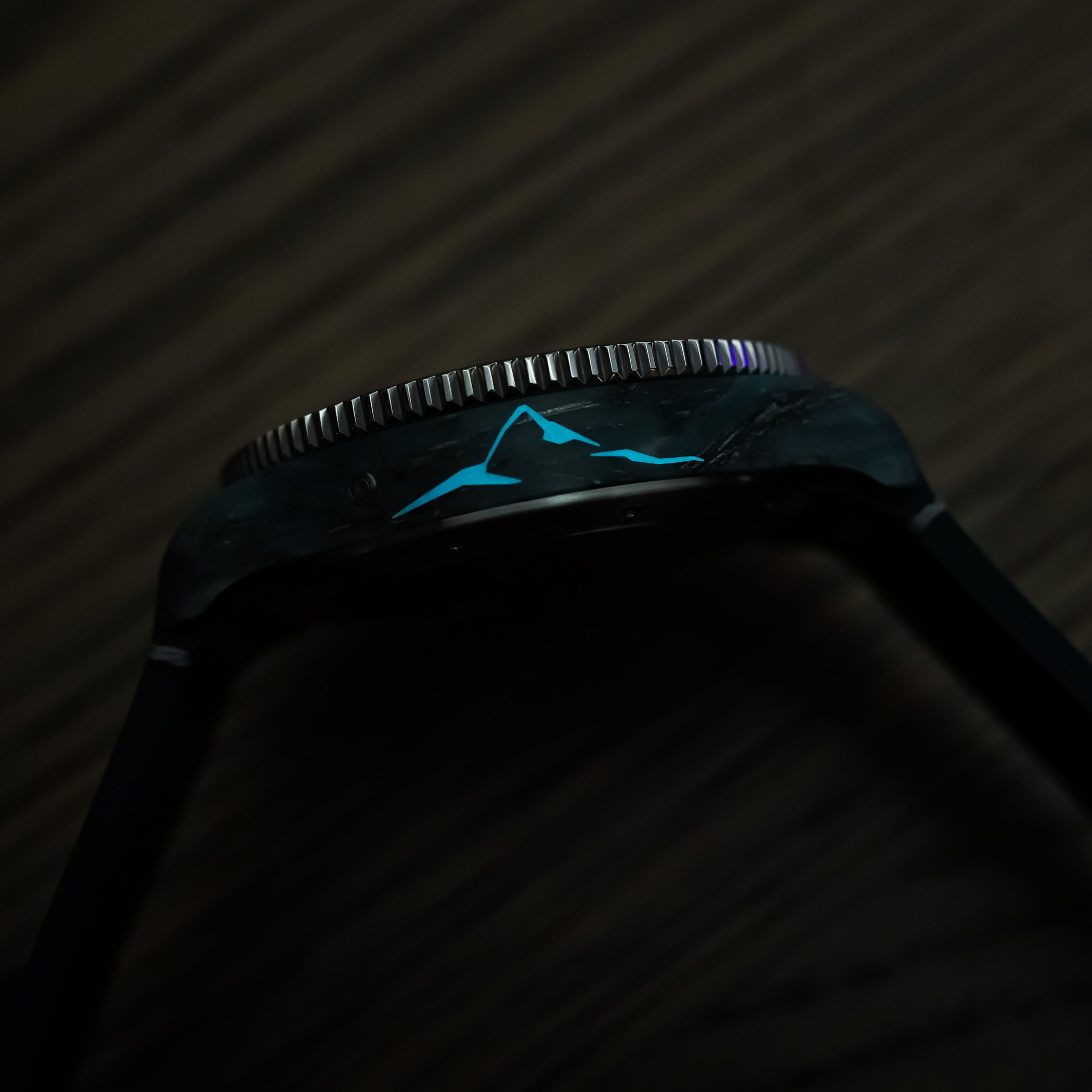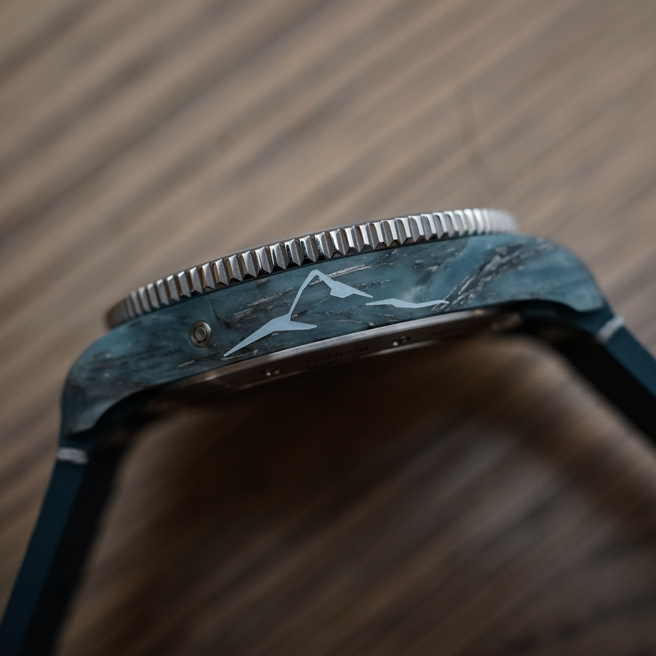 The 1858 Geosphere 0 Oxygen Mount Vinson comes in a 43.5mm x 13mm case with 100m water resistance, designed to reflect the rugged beauty of Mount Vinson’s icy terrain. Its middle case is crafted from a composite blend of quartz fibres, aluminised basalt fibres, CaCO? and light blue resin, strikingly resembling the crystalline patterns of Antarctic glacial ice. Enhancing this connection, the left side of the case showcases a luminous outline of Mount Vinson, glowing white by day and blue by night.