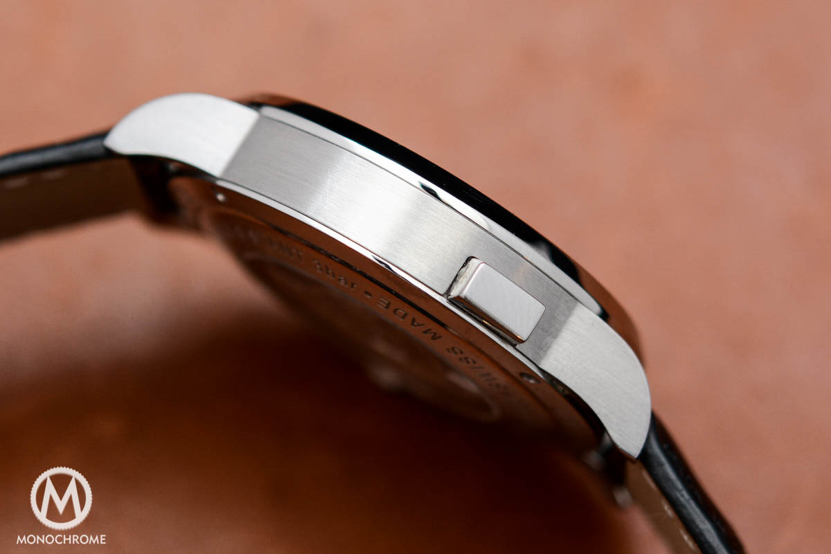 On my average size wrist it wears great, comfortable and also looks like the right size. Besides the pleasant diameter and thickness, the short downward sloping lugs also add to the comfort on the wrist. The Orbis Terrarum comes on a very nice alligator leather strap with double folding buckle. Personally I prefer a tang buckle, however among folding buckles this is certainly one of the nicest and slimmest buckles I’ve seen.
