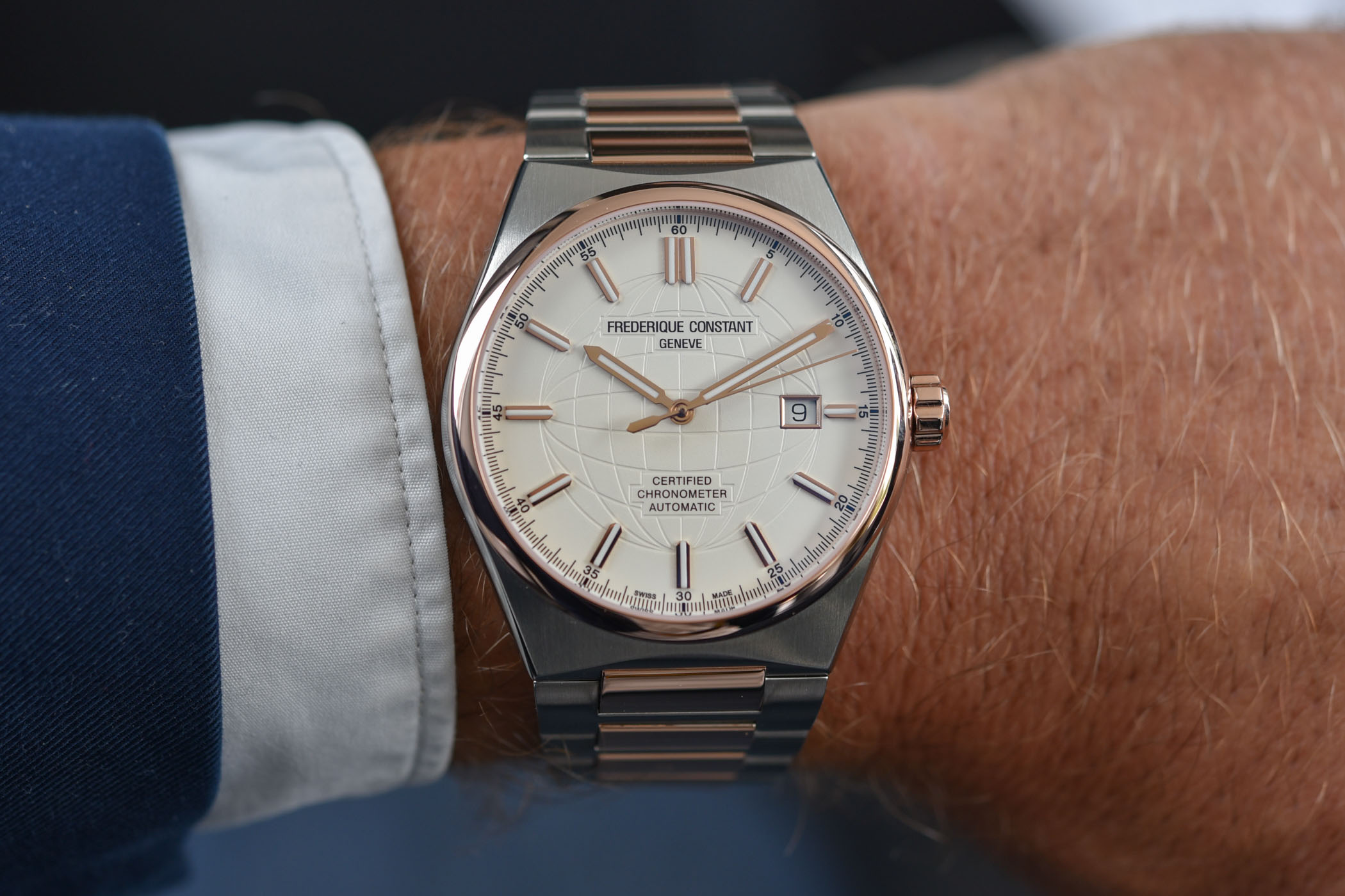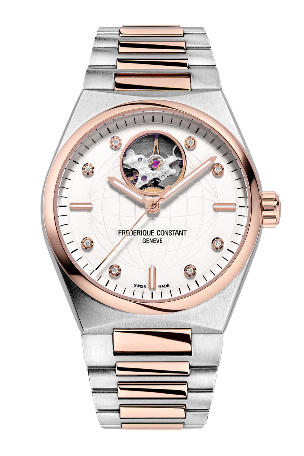 Quick facts: 34mm diameter x 9.80mm height – stainless steel or two-tone steel and rose gold-plated, polished and brushed – 50m water-resistance – convex sapphire crystal over dial, see-through caseback – integrated and interchangeable bracelet – applied luminous hour markers and eight diamond indices – luminous hour and minute hands – FC-310 calibre – automatic – 28,800vph – 38h power reserve – additional rubber strap provided – EUR 1,795 steel model – EUR 1,995 two-tone steel and rose gold-plated model