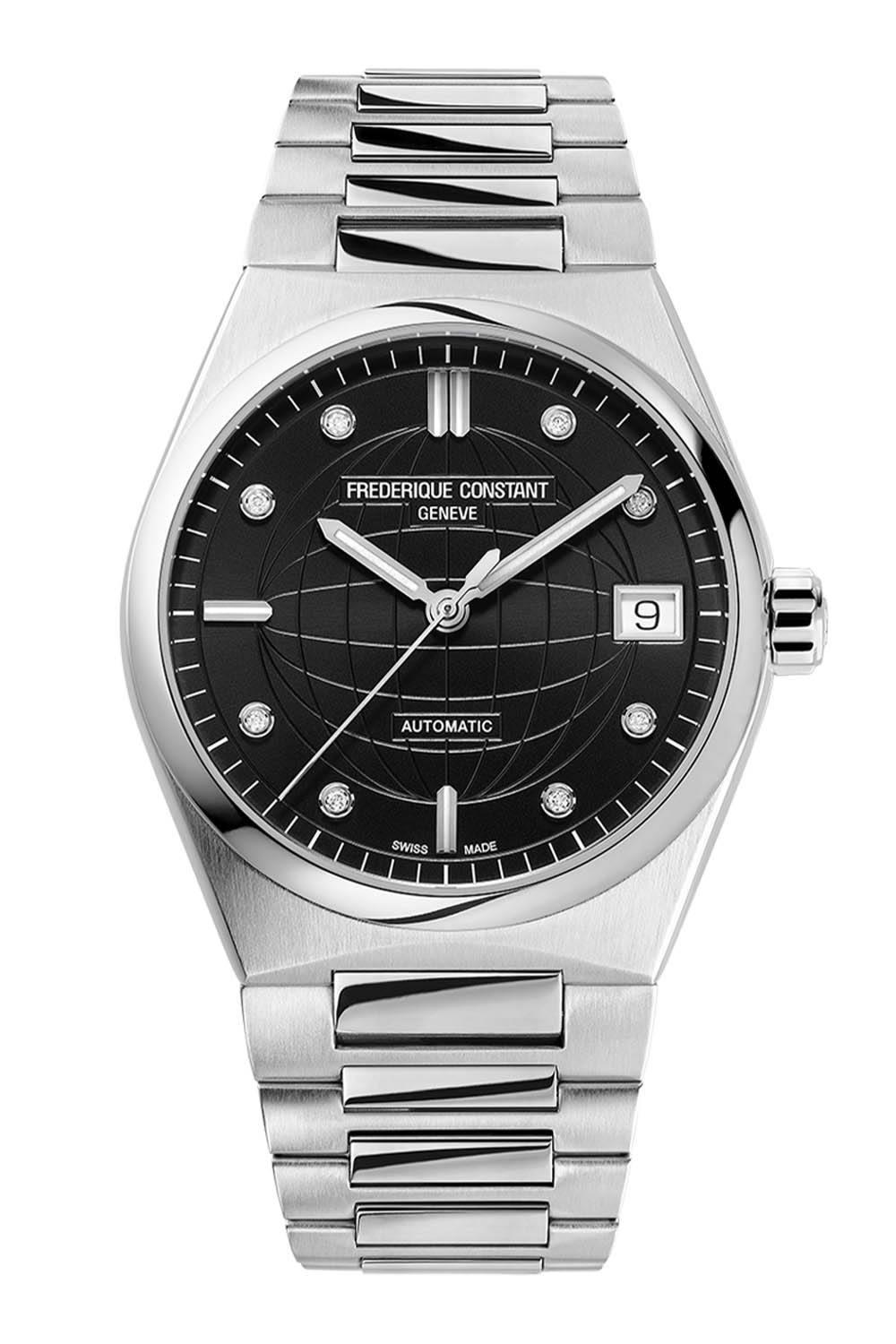 Quick facts: 34mm diameter x 9.80mm height – stainless steel or rose gold-plated steel, polished and brushed – 50m water-resistance – convex sapphire crystal over dial, see-through caseback – integrated and interchangeable bracelet –diamond indices and diamond-set bezel available on some models – applied luminous indices – luminous hands – date window at 3 o’clock – FC-303 automatic calibre – 28,800vph – 38h power reserve – additional rubber strap provided – EUR 1,495 grey dial – EUR 1,695 black dial and diamond indices – EUR 3,295 sparkling dial, diamond indices and diamond-set bezel – EUR 3,995 rose gold-plated with diamonds on bezel and dial