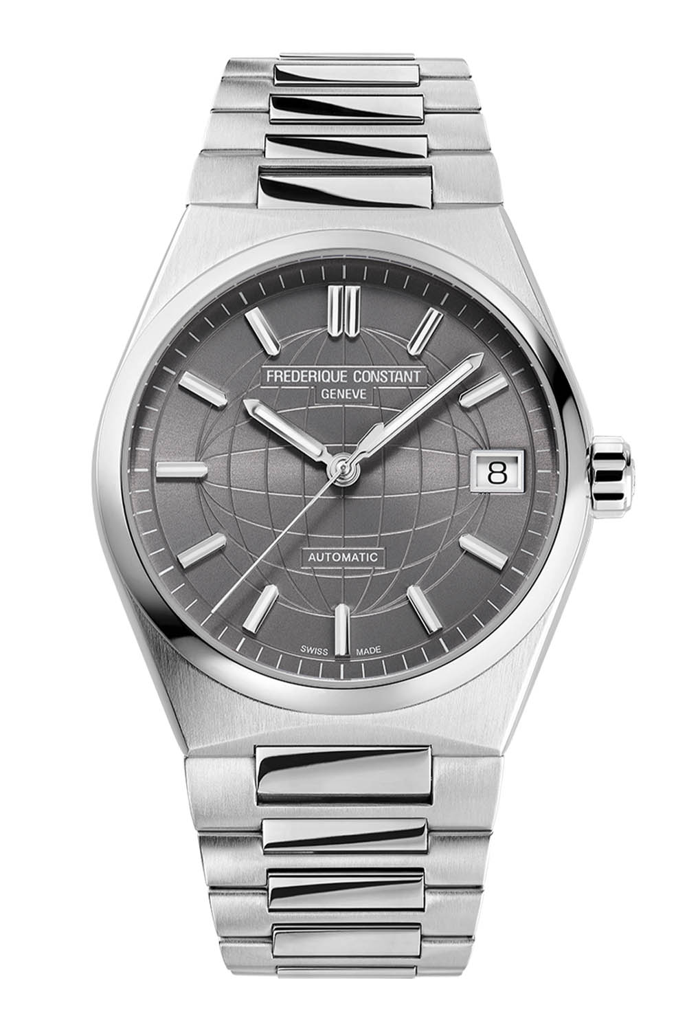 There are four models currently in this category. The most straightforward model is (ref. FC-303LG2NH6B), the 34mm brushed and polished steel model with a grey sunray-finished dial with applied indices and hands with luminescent material. Like all Highlife Automatic models, the centre of the dial is decorated with a globe, and the date window is featured at 3 o’clock. The three-link integrated bracelet can be easily exchanged for a light blue rubber strap that comes with the watch.