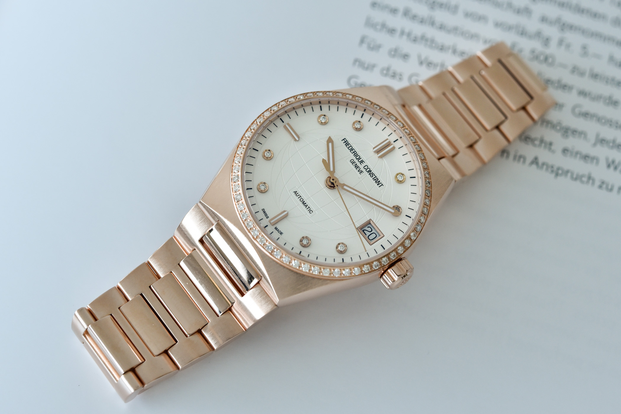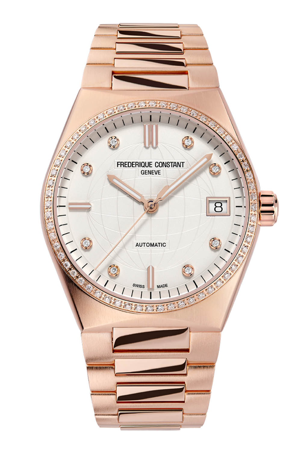 The most luxurious version is the Highlife Ladies Automatic (ref. FC-303VD2NHD4B), with its brushed and polished rose gold-plated case and bracelet. Like the Sparkling model, the bezel is set with 60 diamonds and the white dial hosts eight diamond indices. This model comes with an additional light pink rubber strap.