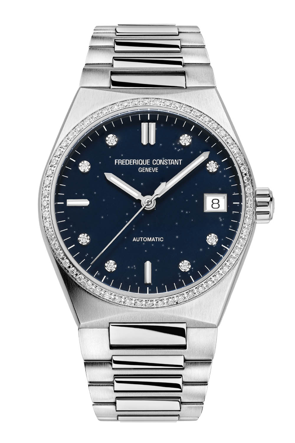The second model (ref. FC-303BD2NH6B) has a black dial but combines applied baton-style markers at 6, 9 and 12 o’clock with eight diamond indices and comes with an additional khaki rubber strap. A third model, known as the Highlife Ladies Automatic Sparkling (ref. FC-303NSD2NHD6B), increases the glamour factor with its sparkling navy blue dial, eight diamond indices and bezel set with 60 diamonds. A limited-edition of 888 pieces, the integrated steel bracelet can easily be switched for the white rubber strap included in the box.