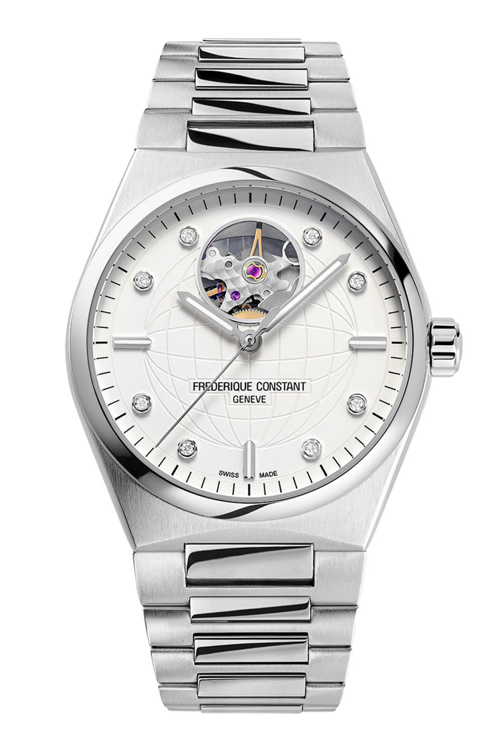 The new Highlife Ladies Automatic three-hand-and-date models for women are available in steel or pink gold-plated cases. They share a 34mm diameter, a height of 9.80mm, 50m water-resistance and feature a see-through caseback revealing the FC-303 automatic calibre with its 38h power reserve. The cushion-shaped part of the case is brushed and features half-moon facets at either end with a round polished bevel. The integrated H-link bracelet has brushed outer links and a polished central link and is interchangeable. A complimentary rubber strap accompanies all Highlife Ladies models.