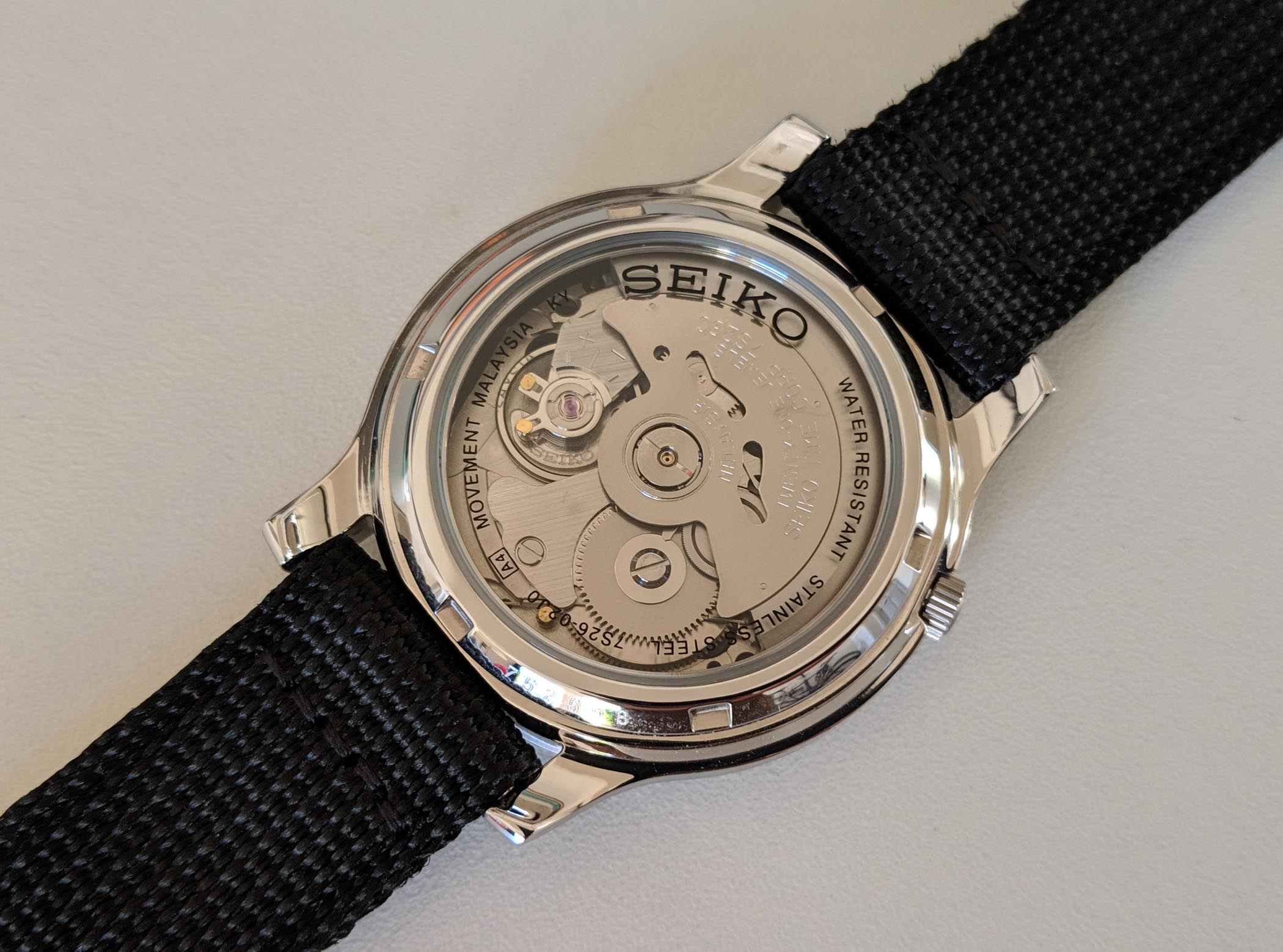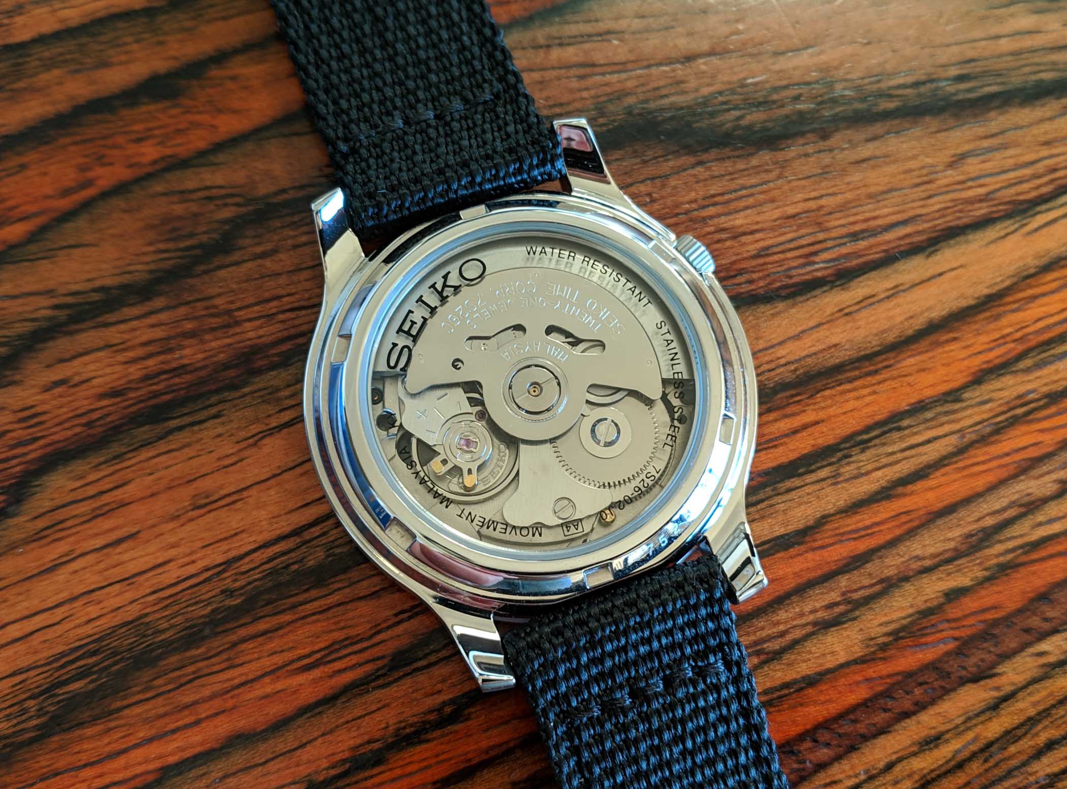 The caseback has a Hardlex exhibition window that displays the in-house 7S26 automatic movement. The polished caseback and rear lugs contrast well with the rest of the matte finish, and the undecorated movement fits the overall aesthetic perfectly. The case has a nice, substantial weight and no-nonsense attitude, and although simple, has real character.