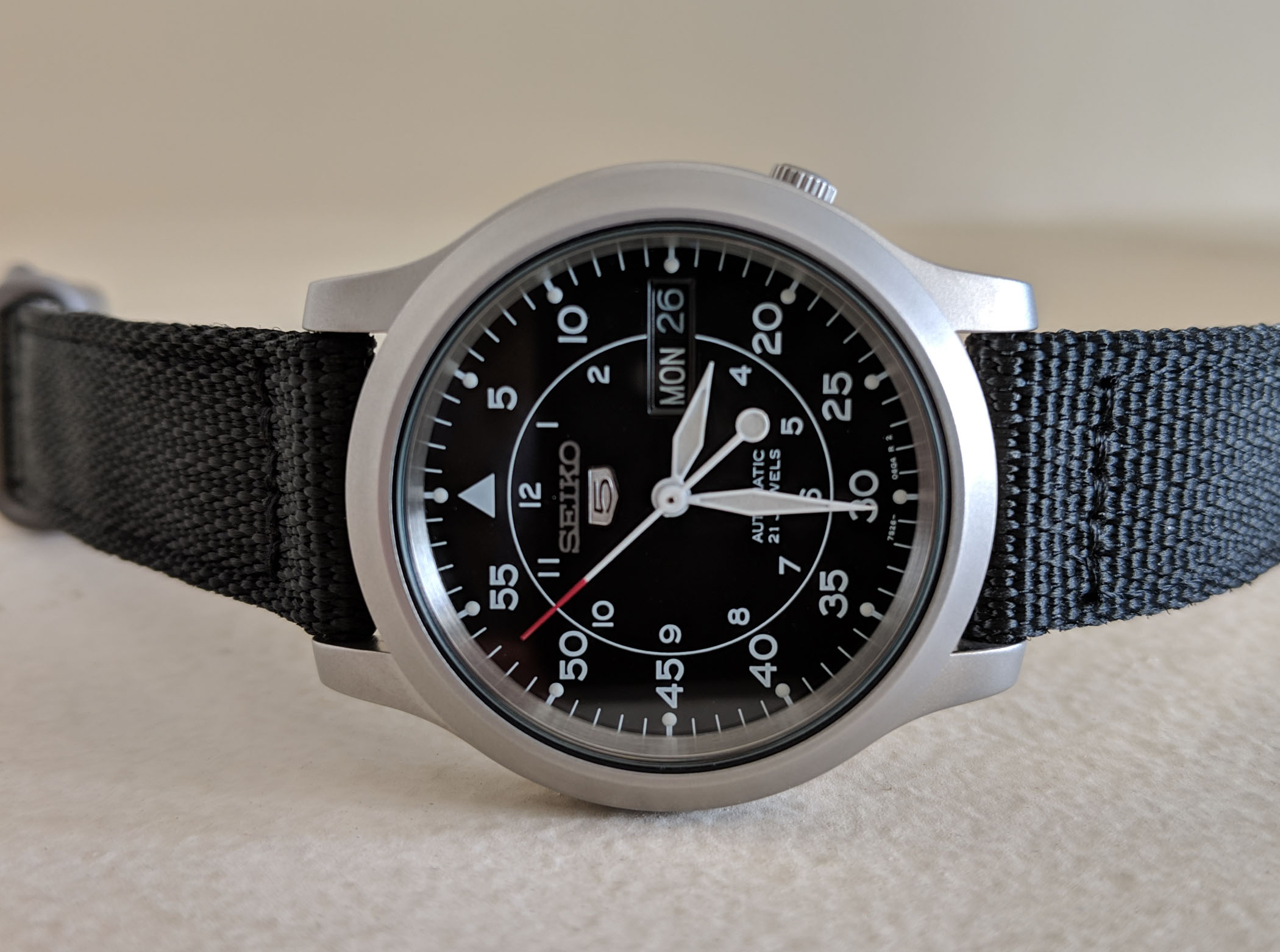 If there’s a standout flaw with this watch, it’s definitely the black 18mm canvas strap. I consider myself something of a strap snob and it’s not uncommon for me to replace manufacturer’s ones with better third-party options. However, the strap that comes with this Seiko 5 is just downright bad. It gets the job done, mind you, and looks decent enough on the wrist, but it’s fairly uncomfortable, snags on the metal loops when trying to strap it on (from the loosely stitched piece covering the holes) and looks and feels cheap while the actual watch does not.