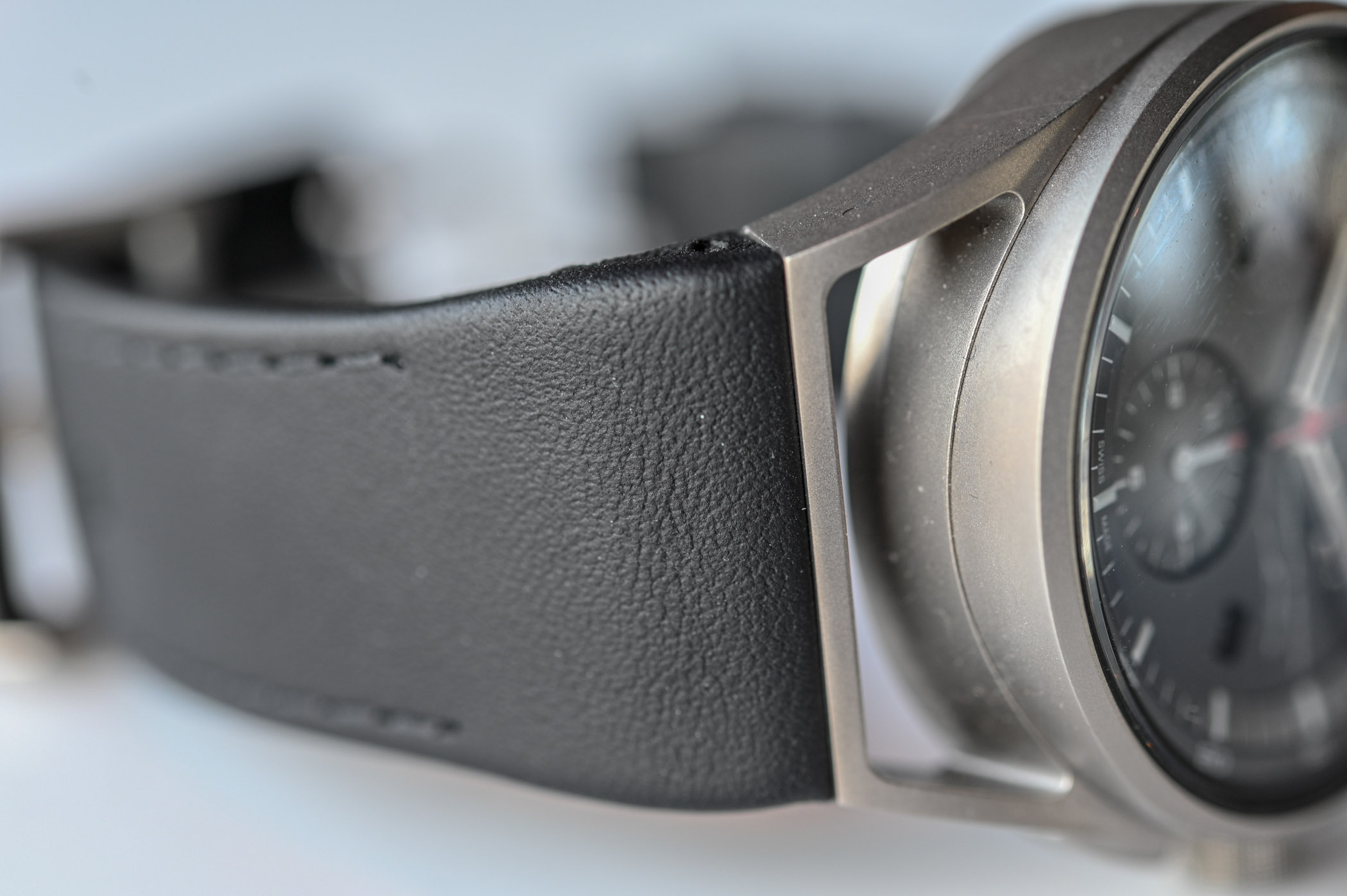 The watch comprises a titanium barrel that holds the movement, dial and hands, and a sort of a lug construction that holds this barrel, which is also made in titanium. On the right-hand side of the barrel are two pushers for operating the chronograph. These pushers are nicely designed and blend in with the curvy shapes of the barrel holder/lug construction. One of those details that matter! Like the crown, which also offers a lot of grip, and the smokey sapphire crystal in the caseback that gives a slightly obscured view on the mechanical chronograph movement. It’s all so well-made, and so well-designed that it doesn’t get boring. When wearing this watch, there’s always a nice line, or curve, or any other detail that is nice to see.