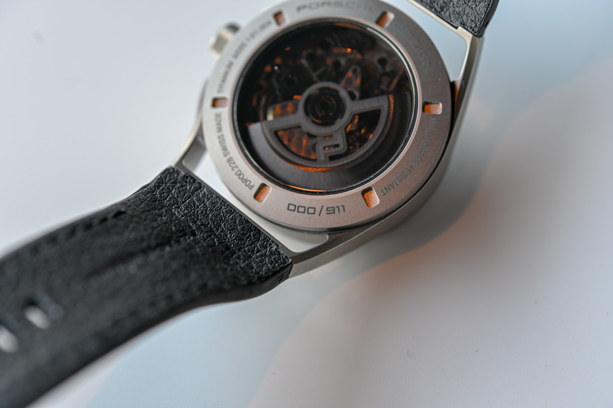 The rubber strap and/or titanium bracelet are very comfortable and make the watch sit snug on the wrist. However, on the 911 Timeless Machine, the rubber strap or titanium bracelet have been replaced with leather from the new 911. It looks great, feels good on the wrist and the idea to have the same leather around your wrist as the leather used on the 992’s steering wheel or seats is very cool.