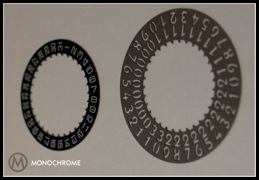 The movement ring is attached to the mainplate and both parts are fully DLC treated. In the case, the movement is fixed with movement holders designed by Sarpaneva. The photos above show a movement without DLC treatment and with the DLC coating. In one of the photos you can see the Sarpaneva movement holders. The skeletonized date disc is typical for Sarpaneva. The date numbers are laser-cut in a stainless steel disc of only 0.15 mm thin. The photo shows a generic Soprod date wheel next to his date wheel.