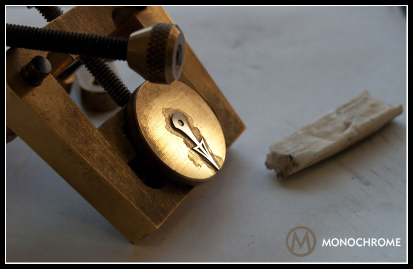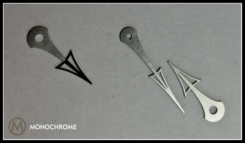 Making and finishing the hands, dial and rotor is very time consuming. The hands are first laser cut and than black polished by hand. The black polishing of the hands is something that takes approx. half a day per hand. After the hands are black polished, the part closest to the middle is sand blasted. The end-parts of the hands remain black polished.