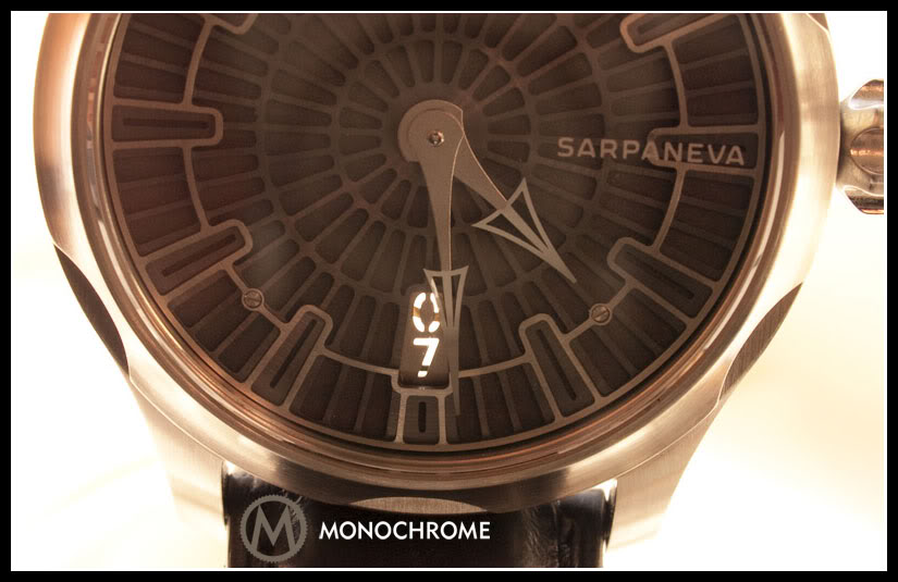 The sapphire crystal has a multi layer anti reflective coating, applied only on the inside. This is to prevent the AR coating from getting scratched when time passes by. The name SARPANEVA is also printed on the inside of the crystal.