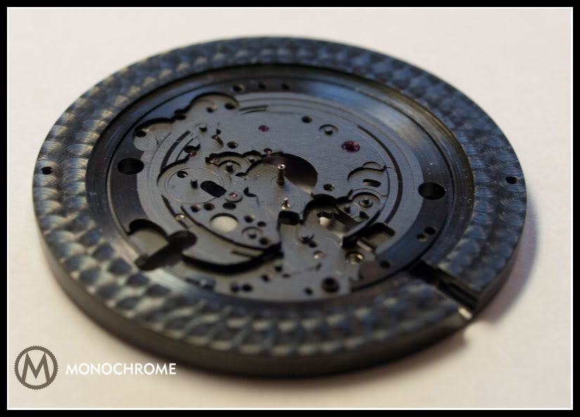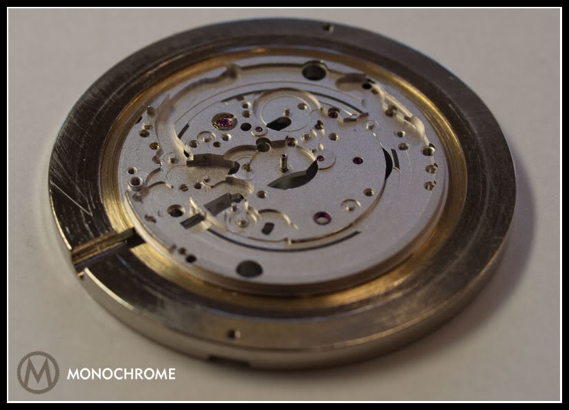 Sarpaneva modifies the Soprod A10 to his own demands. Besides the polishing and finishing that Stepan Sarpaneva does, there are some modifications that are necessary for the design. For instance, a hole is laser-cut in the main plate. The position of this opening is exactly behind date window and date wheel, to make it possible to look through the date window, date wheel and mainplate and see the oscilation of the balance spring.