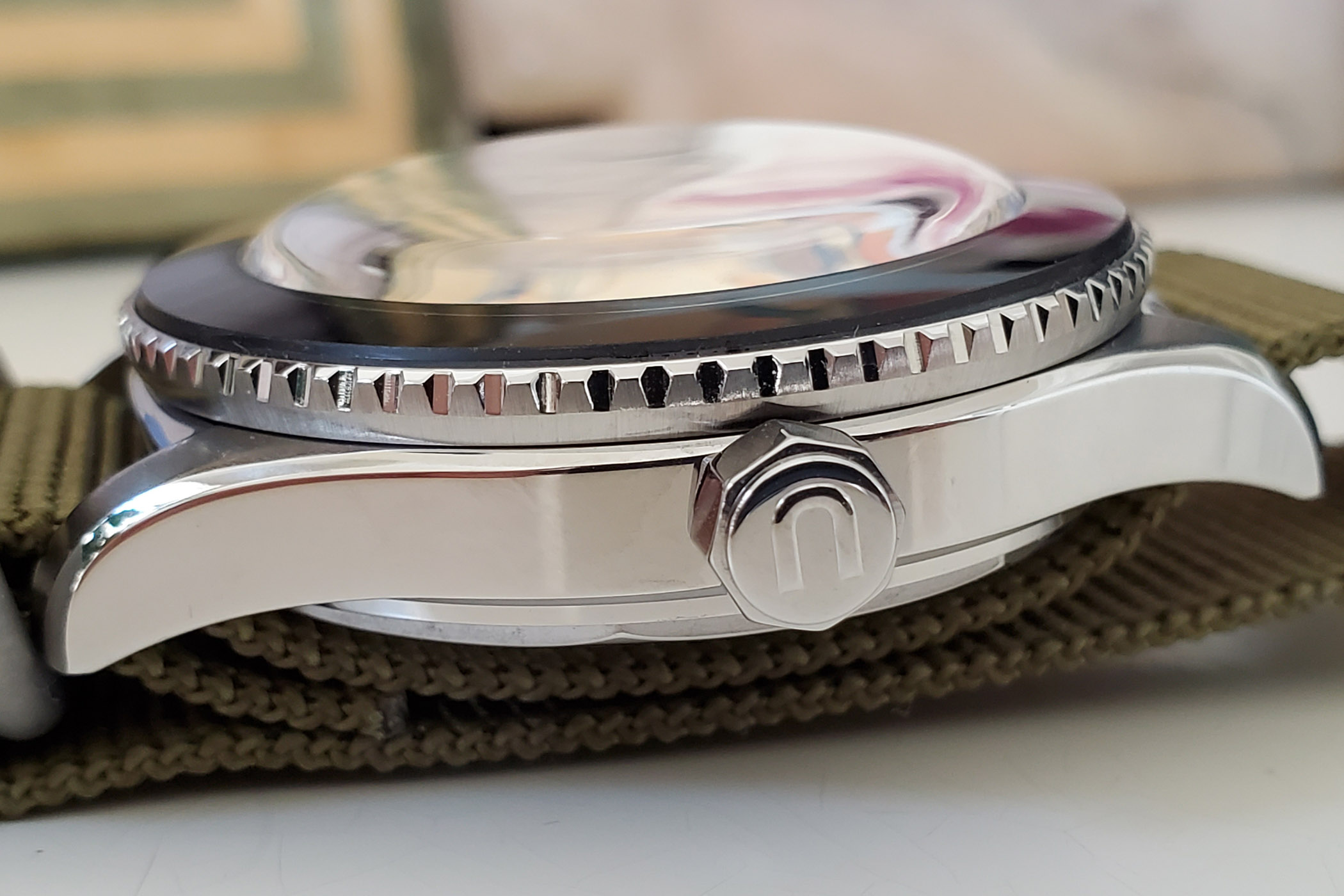 The reviewed piece has a polished steel case, although either a PVD-coated black or gold finish is also available. A nice chamfer also spans the top edges from lug to lug. The bidirectional bezel is a sterile black ring with a single triangular marker (with lume), although a standard graduated “diver’s” bezel is available as well (starting in May 2019). It rotates silently and smoothly without a ratcheting action and is both tight and precise. The case is rated at 50 metres of water-resistance, making it a questionable choice as a true diver’s watch, but rumour has it that UNDONE tests these to 100 metres and rates them conservatively. The signed screw-down crown, like the Aqua, is a smooth octagon and there isn’t a crown guard this time around.