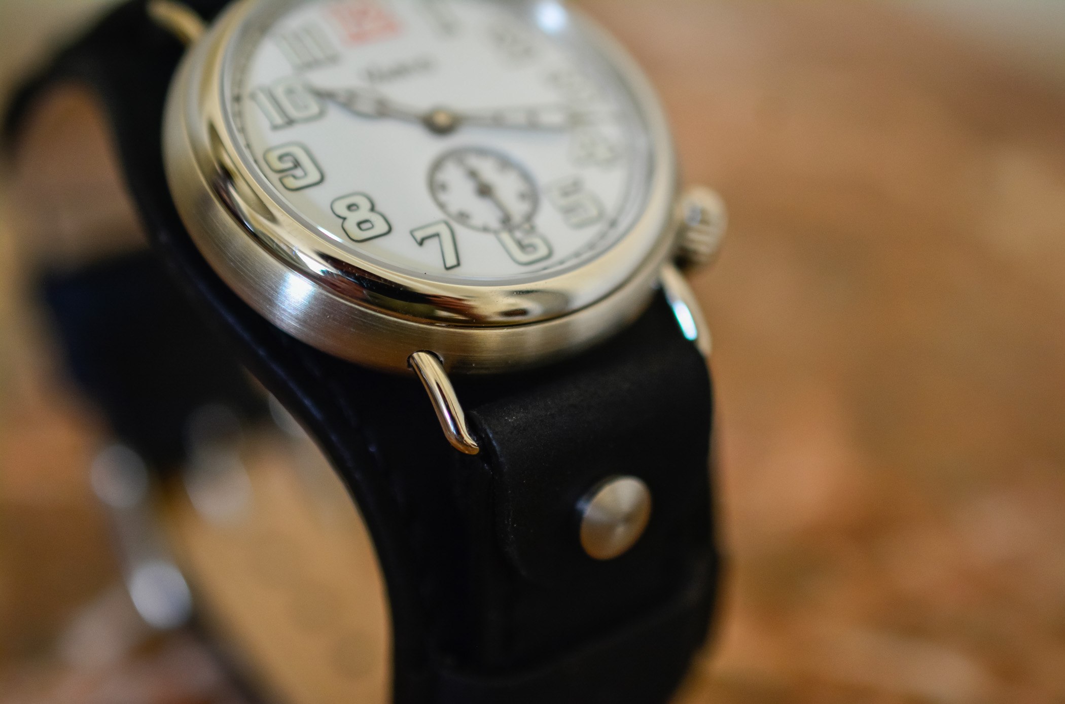 The seconds sub-dial at 6 ‘clock partially cuts off the 6 numeral, although most original watches had a lower sub-dial and removed that numeral entirely. A minor quibble that takes nothing away from the overall aesthetic. A thin railroad minute track spans the outermost perimeter. Notwithstanding a few modern tweaks, the case and dial combination perfectly encapsulate the World War I look.