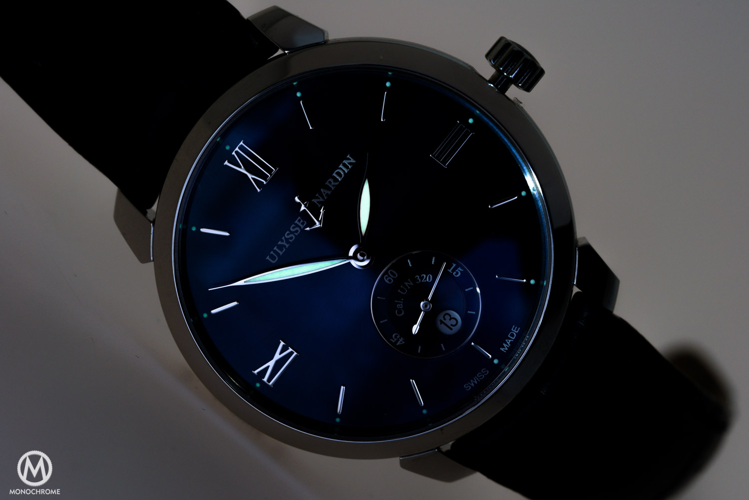 The rather understated shape of the sword-shaped hands – one of Ulysse Nardin’s signatures – contribute to the classic look of the watch. Legibility is outstanding during the day and sufficient during night, thanks to the luminous hands and hour markers.
