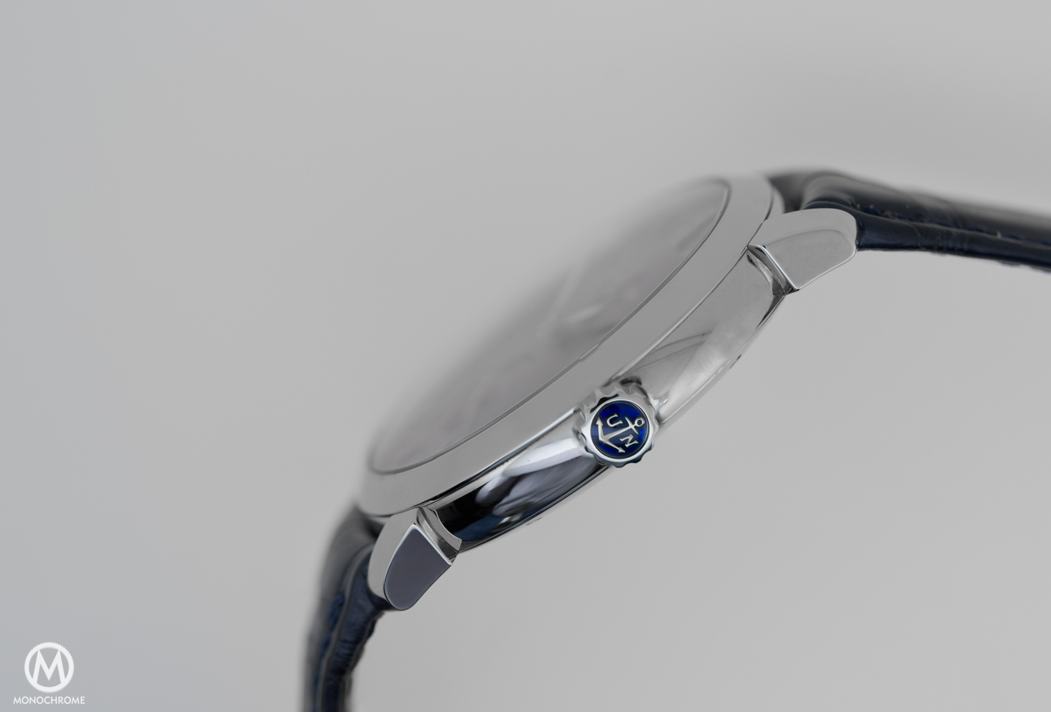 Front and back look totally different. The front looks delicate while the back reflects the boldness of a ship’s porthole. One could argue that a classic dress watch should also feature a more delicately designed case-back but this designs matches the DNA of the company better. The case-back is fixed via screws. The UN logo inlaid into the crown gives a nice touch to the watch.
