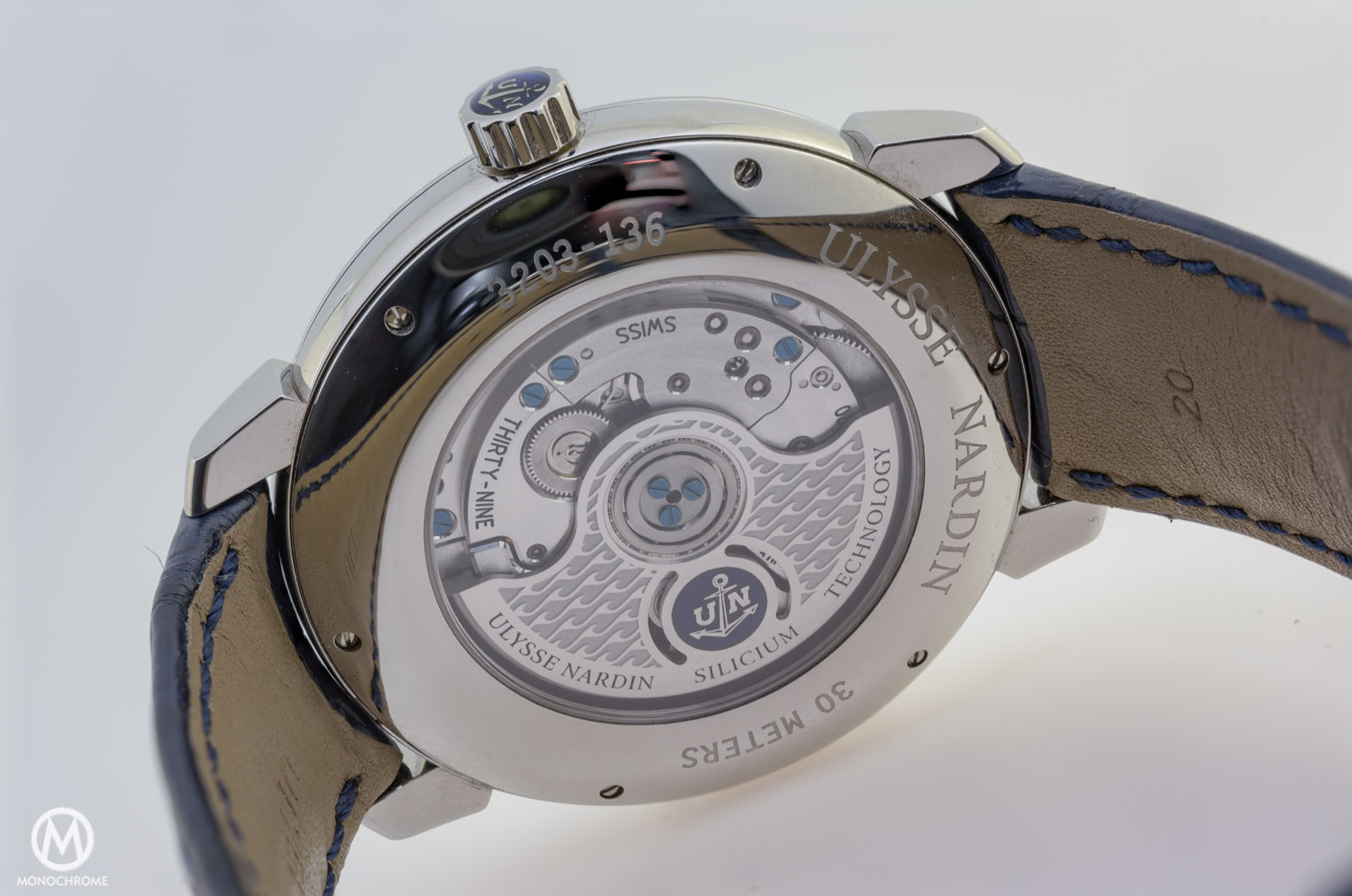 The first words that sprung to mind when I saw the watch were: “classic”, “understated” and “dress watch”. The dimensions and the design (including the short curved lugs, the large dial, and the perfect 9,6mm case thickness) provides the perfect blend of elegance, class and balance. The 40mm case fits very well on the wrist. It is a pleasure to wear and makes you forget that you are wearing a watch while working behind a desk. The anchor on the dial and the typical UN plate on the side of the case is a constant but gentle reminder of Ulysse Nardin’s nautical DNA.