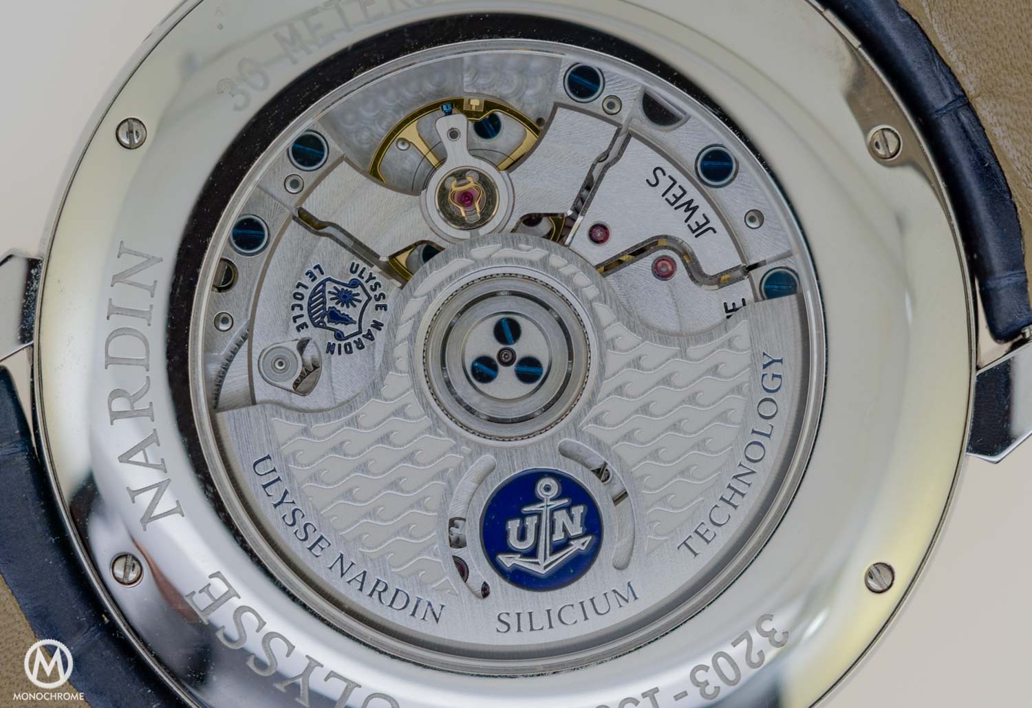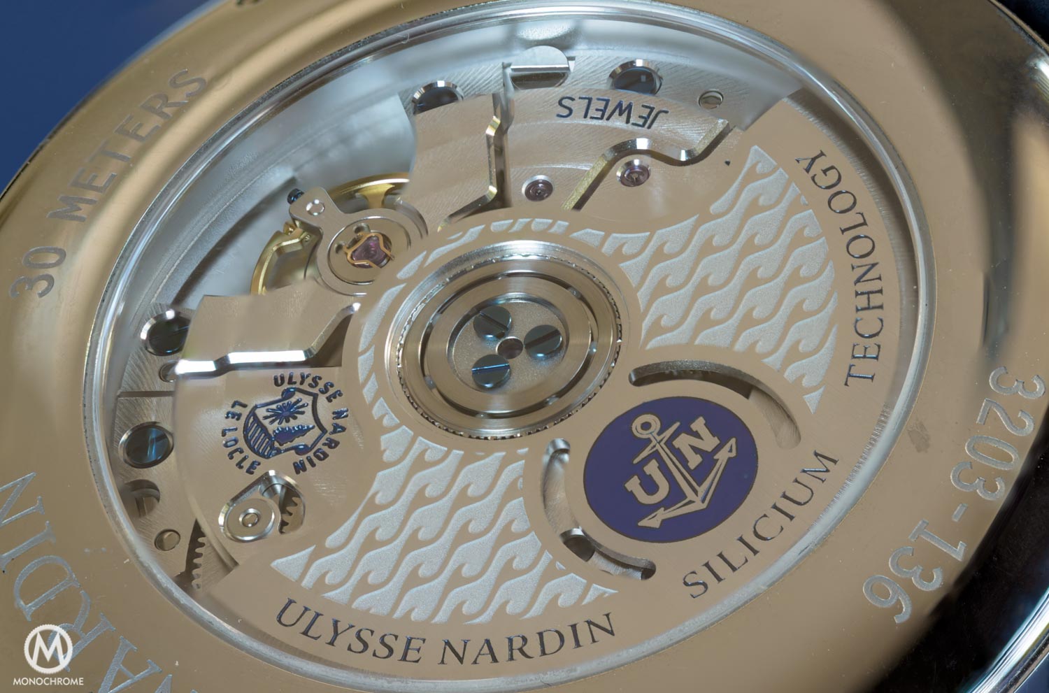 The designers of Ulysse Nardin aimed to keep the dial as simple and understated as possible. Embossed roman indicators mark the third, ninth, and twelfth hour and embossed bars mark the remaining hours. Leaving out the location of the company gives more space around the name and the anchor. The design is wonderfully balanced. The “U” in Ulysse is aligned with the top of the 7 o’clock marker, the “N” in Nardin with the top of the 5 o’clock marker and when you draw a straight line from the dots at the 6 and 12 positions, the line goes through the middle of the date window, the sub-dial, the “UN” indication in the sub-dial and the anchor. This contributes to the balanced look. The in-laid sub-dial, with its 2 types of ribbons, fonts, and date window is itself wonderfully designed too. The sub-dial displays seconds and date. The small round date window reads well and its shape is indicative of the nautical heritage.