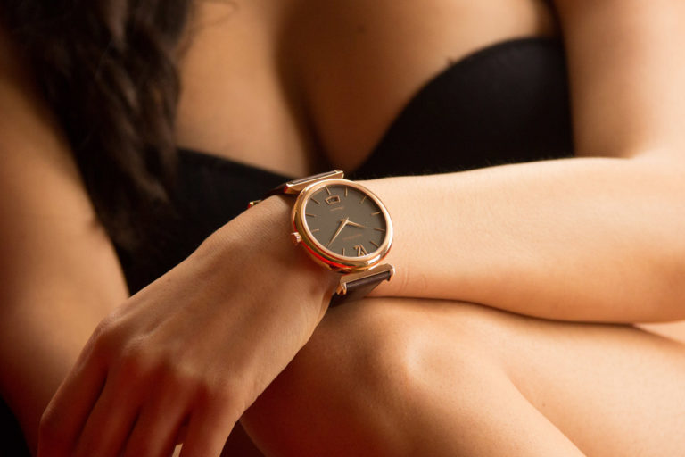 The hands and hour markers on all different models are pink gold and the dial is offered in either black or silver. Because of the plain case, the dial looks more retro then it actually is. A closer look reveals very modernly shaped hands and Luminova dots above each hour marker. The double markers at 3 and 9 o’clock make it easy to read the time, and also the Arabic numerals on the 12 and 6 o’clock position enhance easy reading of time. The 6 is partially cut off because the Classical 82 Round has a so-called ‘six-eater’; a small sub seconds display at 6 o’clock that takes up most of the space where the 6 should have been.