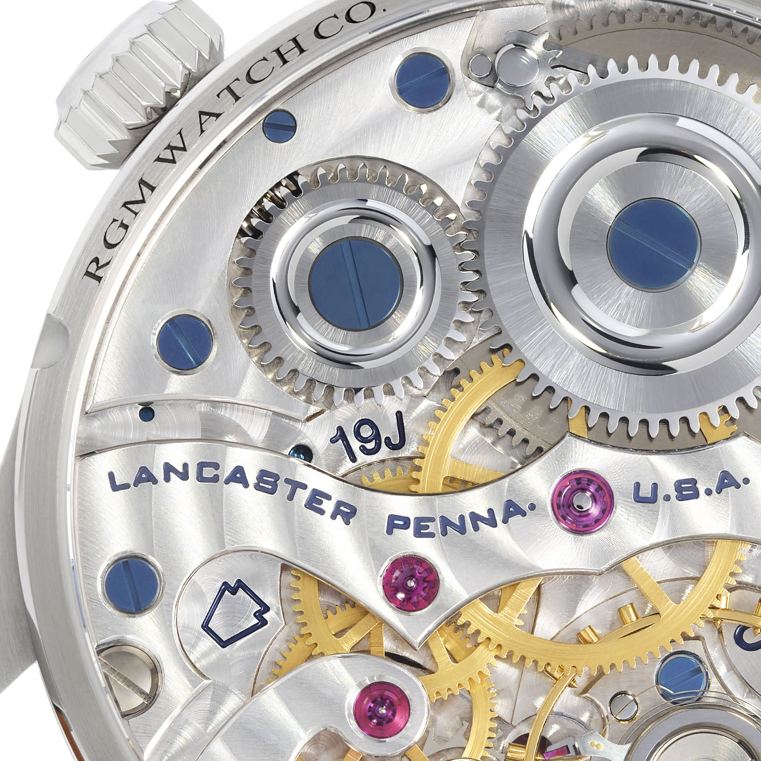Paying homage to the good old days of American watchmaking, the bridge shapes are reminiscent of Keystone-Howard Watch Company’s flagship “Edward Howard” model and the winding click was inspired by the Illinois “Bunn Special”, an American-invented motor barrel used in the highest-grade railroad watches. Hand-finished embellishments include circular damascening, chamfered edges, Geneva stripes and blued screws. However, as RGM points out, the decoration of the calibre can be customised and options like hacking seconds, wolf’s teeth winding wheels, and custom engravings on the balance bridge are also available.