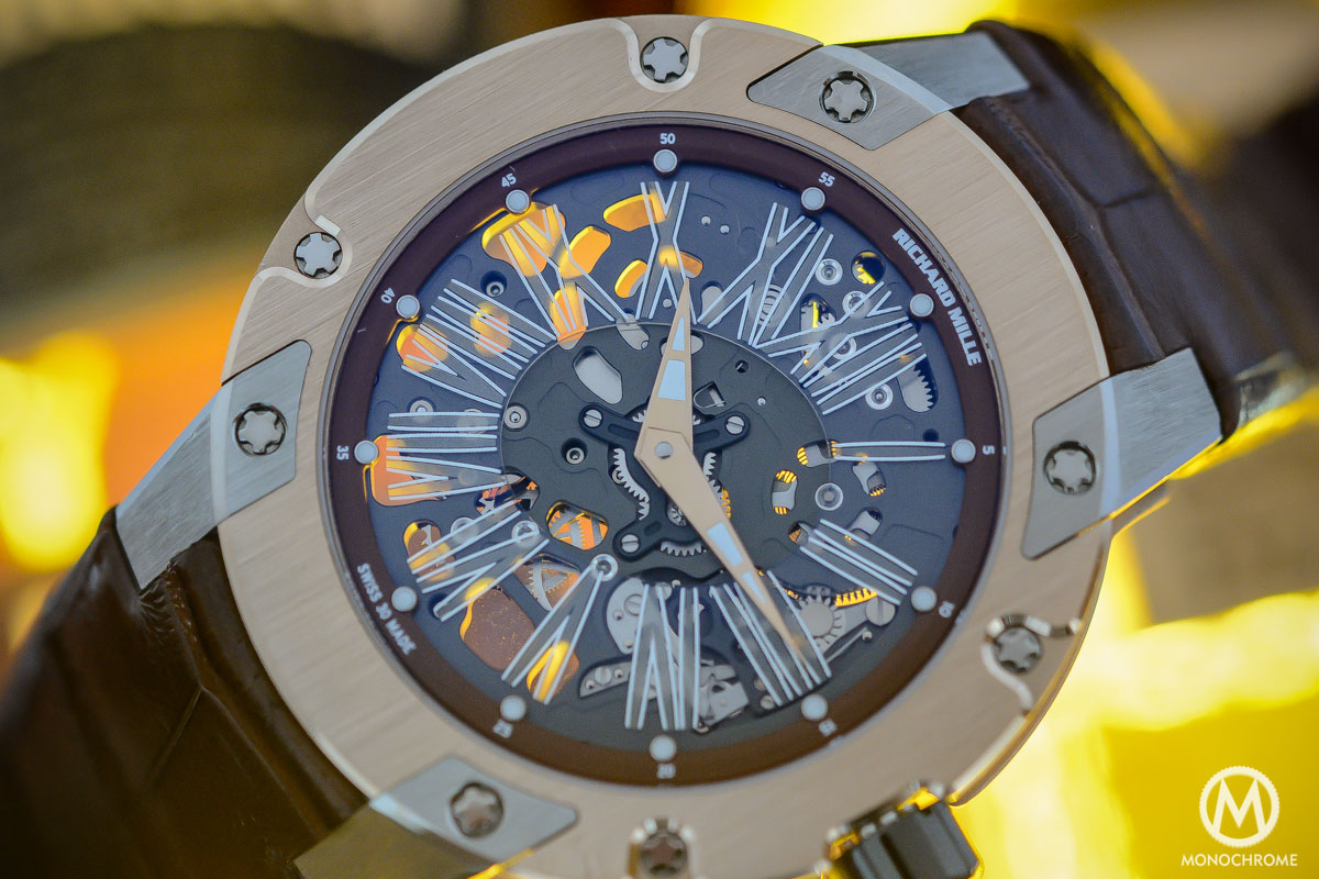 The hands are typical to Richard Mille – meaning that they are masculine, pointy and sharp, and moreover they impress with a superb execution. The flat surface is finely brushed and the periphery is chamfered and polished, meaning that they are not “stamped” like the hands found in the vast majority of watches out there; here the hands are milled and finished by hand. The overall look of the dial remains (for a Richard Mille of course) very simple, as only 2 hands are running and no other indicator / complication can be seen. The use of Roman numerals also confirms a wish to be more elegant and refined. However, we’re at RM and clearly, this watch is highly technical, masculine and far from the traditional codes of a tuxedo watch. The face isn’t as sporty as other RM watchers and could well be associated with dress attire, while it still feels like a RM.