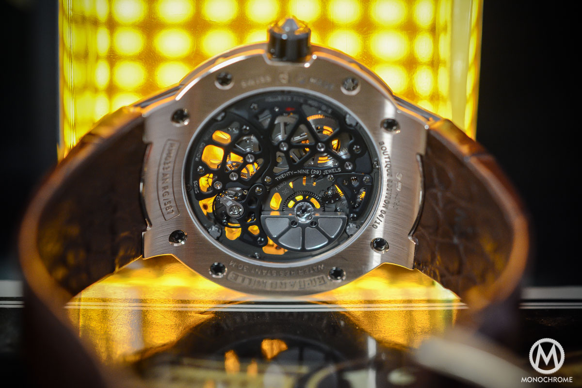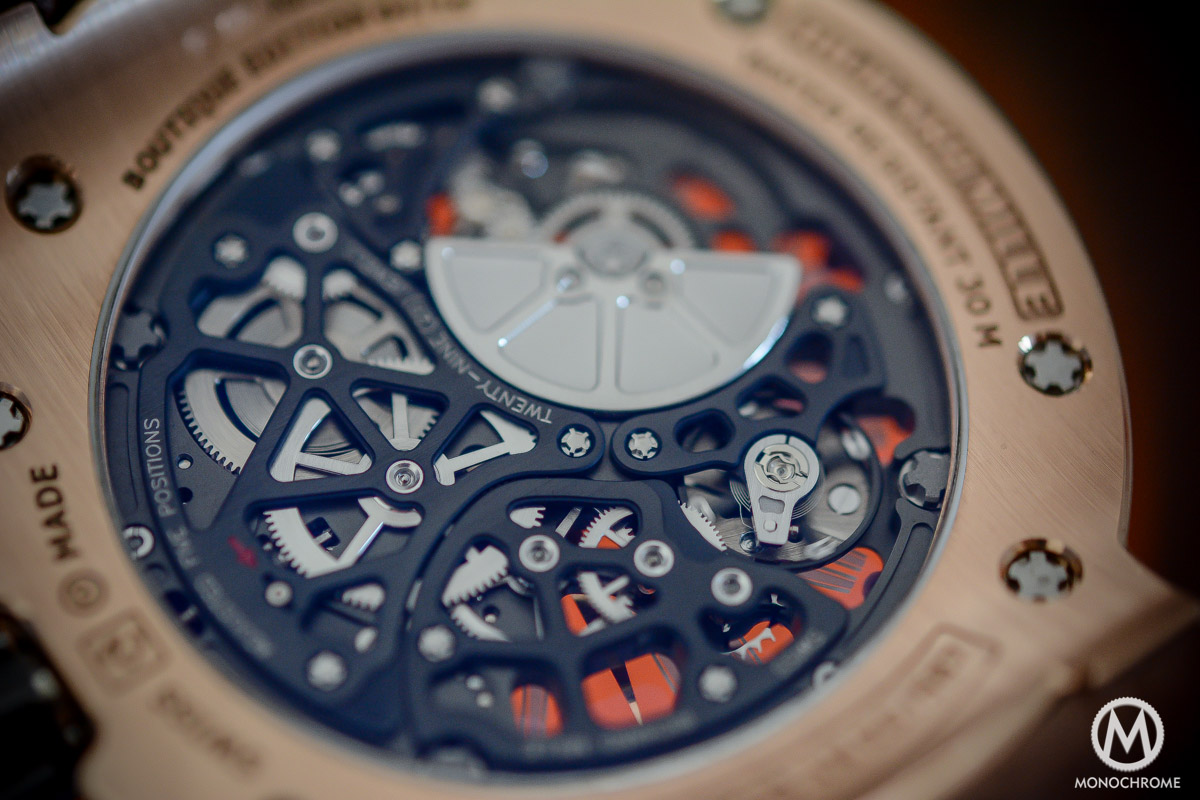 The case of this Boutique Edition Richard Mille RM 033 (limited to 10 pieces) is a mix between 18k red gold for the bezel and the case back and of grade 5 titanium for the central container and the lugs. The case’s details are 100% Richard Mille, with a 3-part construction (tripartite), all the parts being linked together by 16 spline screws in grade 5 titanium – a classical feature of the RM watches. All the parts – bezel and lugs – feature large and highly polished chamfers that contrast with the straight-brushed finish of the flat surfaces. It feels RM but with a bit more luxurious and dressy approach, something that is emphasized by the use of a brown alligator strap – again not usual in the RM collection.