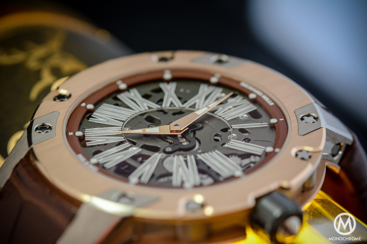 The RM 033 is a Richard Mille, and thus, like every RM, we can’t really talk about a dial here, but more about a view on the movement partially hidden by hands. From this point of view, the Richard Mille RM 033 follows the trend of most of the timepieces created by the brand since its very beginning in 2001, with the RM 001, meaning that the dial is in fact the main-plate of the movement. Then, something that is also recurrent at RM is the use of layers of sapphire crystal to create flanges and tracks. So, in the case of the Richard Mille RM 033, we have as base, the sandblasted anthracite grey plate of the movement. On the top of that is a ring of sapphire crystal with Roman numerals printed, to create the hour track. This layer of glass only partially covers the movement and the hole in the middle isn’t round but oval, making the numerals also changing in sizes – this to break a too classical and round look.
