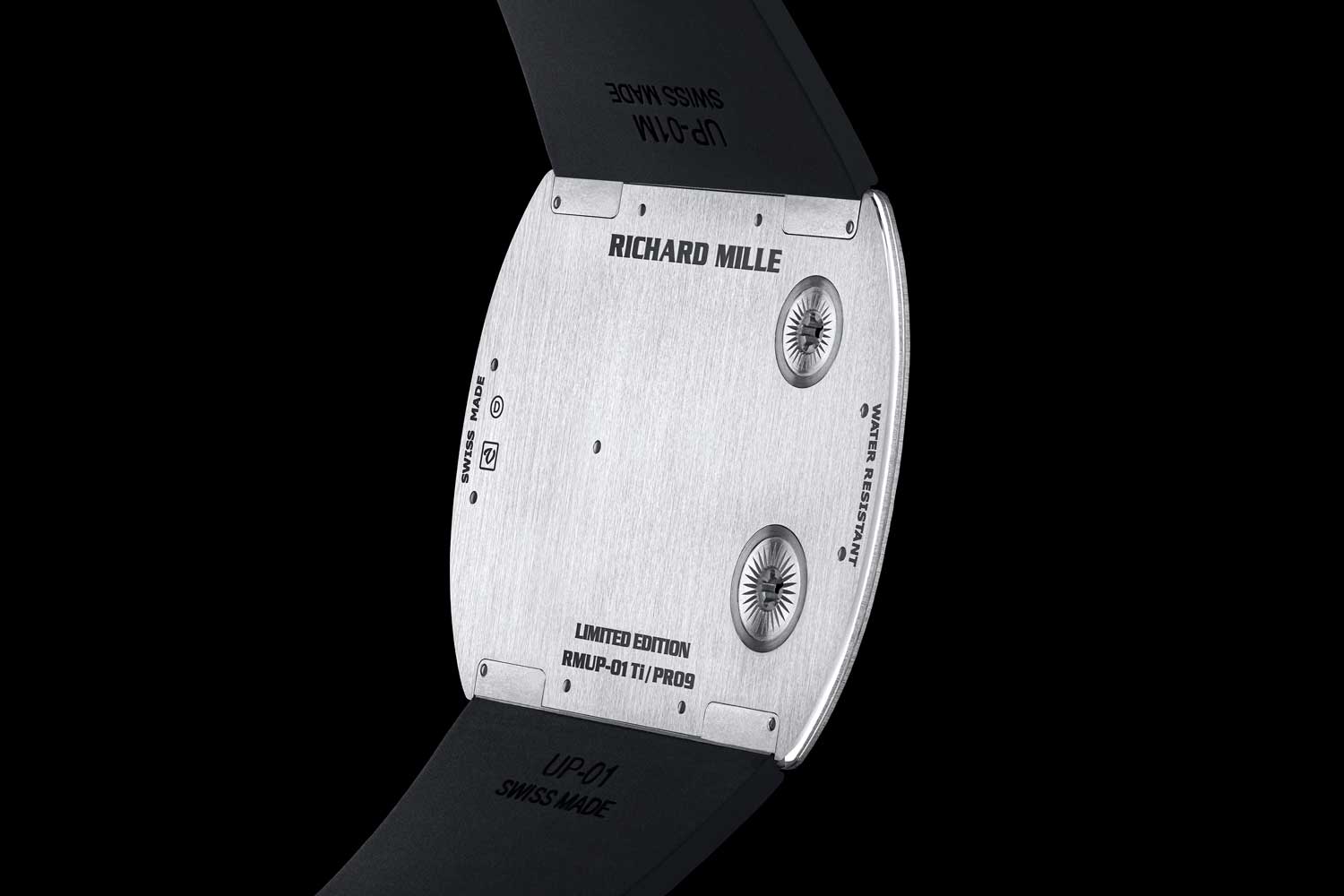 The extraordinary architecture of the movement – which does not rely on the caseback as part of the movement – is traditional and is assembled inside the case. The reason for incorporating the 41.45mm x 28.85mm calibre inside a case was mandated by shock-resistance and RM’s mission to create a watch for everyday wear and tear. What is not traditional is the distribution of the components. Instead of a conventional arrangement of superimposed gears, hands and stacked components, the RM UP-01 conquers its ultra-thin profile with a horizontal distribution of elements. To keep the thickness of the calibre at a minimum, engineers from AP Le Locle and RM developed a new escapement with a balance wheel in titanium. All the components, which have to meet tolerances of a single micron, are machined at RM’s movement department. Fitted with a fast-rotating barrel, the power reserve is around 45 hours.