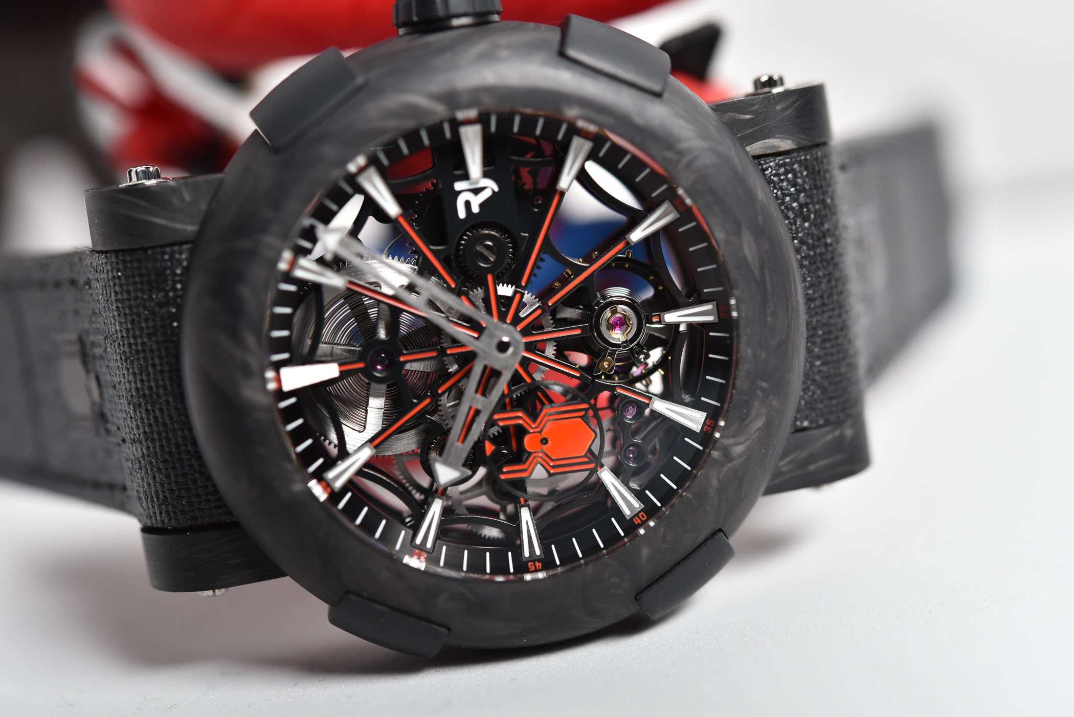 Turning the watch over, the titanium caseback is secured by 6 screws. It offers an unimpeded view of the skeletonized movement. The hand-wound calibre RJ-3005 is based on a Concepto ébauche and manufactured in the brand’s new manufacture in Eysins. It runs at 28,800 vibrations/hour with a 48-hour power reserve. Worth mentioning is the characteristic “octopus” spring, which is actually three springs in one: pull-out piece spring, lever spring and click spring.