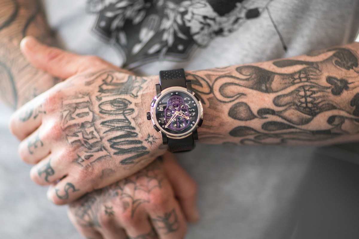 The H9C-DNA is a unique piece, as is the bike, and they are only available as a set. The bike and watch share design cues throughout. The watch is built using the Skylab Red as a base, sharing its case and movement. The skeletonized movement is partially covered by a big openworked, floating skull, mimicking the logo of HardNine Choppers. Finished in the same purple metal flake paint as the bike, it really stands out against the black movement. The openworked “9”on its forehead shows the barrel, while the teeth partially hide the balance wheel. It must be quite a spectacle to see it moving back and forth behind those purple choppers!