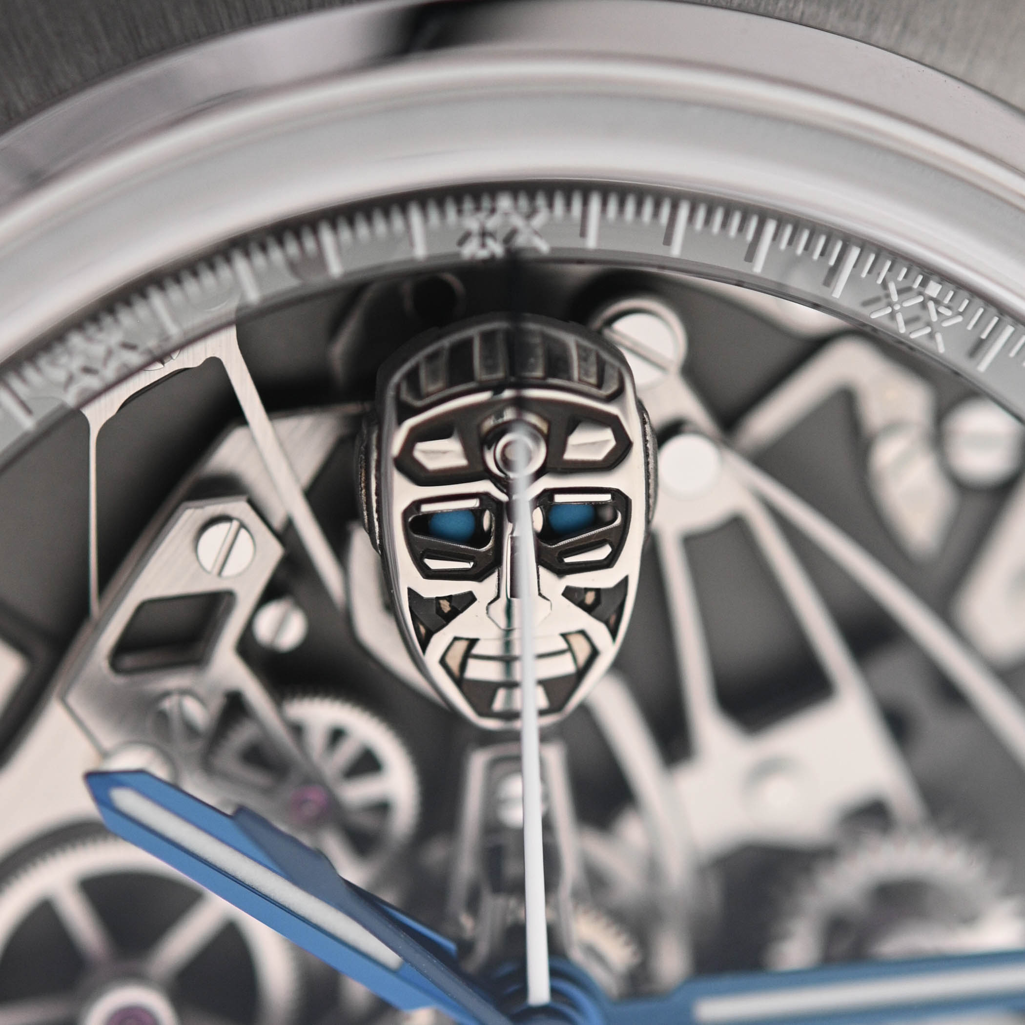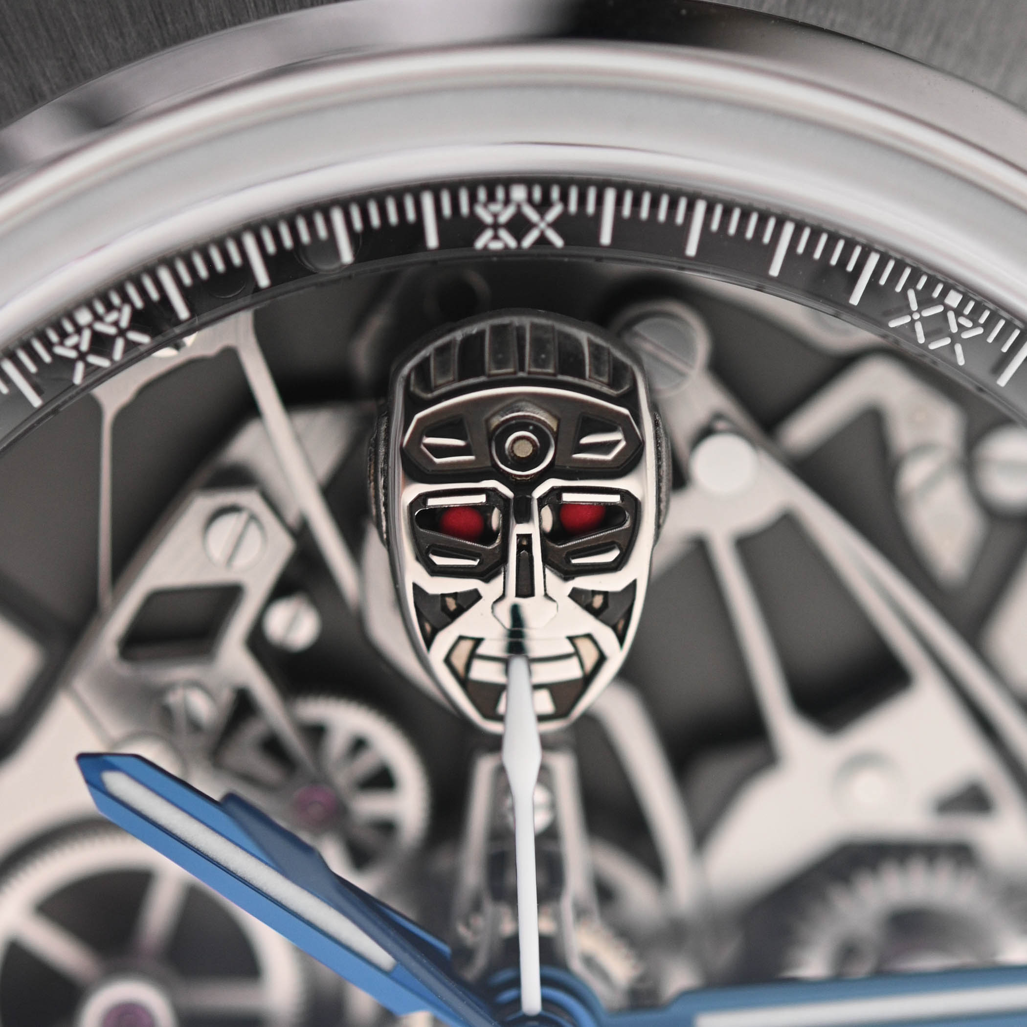 Just like the first iteration of the Antarctique Rattrapante, the engine of this new limited edition is the SXH6 calibre, developed in partnership with Chronode. While much of the movement’s architecture appears unchanged, some differences and upgrades distinguish this version. The SXH6 self-winding calibre is still distinguished by its dial-side split-seconds chronograph, showcasing its intricacies on the front rather than concealing them on the back, as is typically the case. This monopusher chronograph features a horizontal clutch and two column wheels: one dedicated to the rattrapante and the other to the chronograph – the latter now concealed beneath the robot head. Integrated into the movement, his eyes change colour with the chronograph’s functions: yellow when running, red when stopped, and blue when reset. The robot’s head, created by MD’Art, is a miniature work of art; it is cut, hand-polished and laser-engraved, and each of its eyes is micro-painted by hand using neon tones of the three colours.