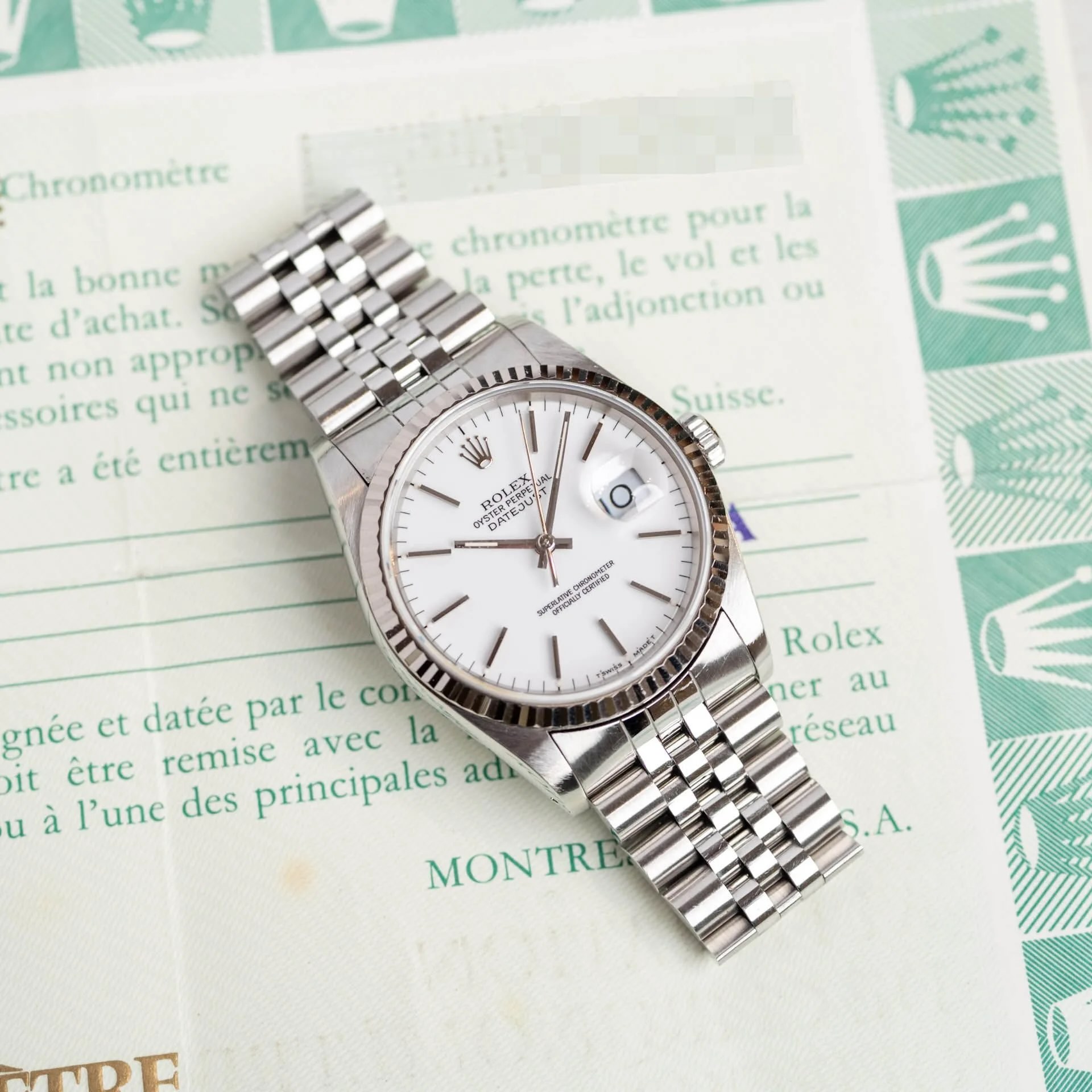This reference introduced a new movement, calibre 3135, but only small technical improvements made it a bit more accurate and reliable. It featured Rolex’s thermally stable glucydur balance wheel with microstella regulating screws, and the patented antimagnetic and shock-resistant Parachrom hairspring. However, the big change with this reference was the transition from acrylic crystals to sapphire, which represented the final piece that brought the Datejust into the modern age. Aesthetically, little changed other than the usual smorgasbord of dial options, combined with different bezels and two bracelets (Oyster or Jubilee).