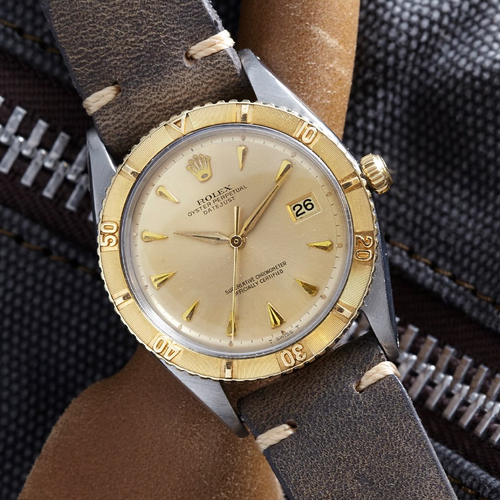 This was an interesting Datejust variant that featured a rotating timing bezel in lieu of a smooth, fluted or engine-turned design. It was an evolution of the Turn-O-Graph from 1953, ref. 6202, which was Rolex’s first production model with a rotating bezel (just beating out the Submariner by a few months). It was a time-only piece with a skin-diver vibe and featured a black aluminium bezel insert and a detailed 60-minute scale. In a probable effort to avoid direct competition with the new Submariner, the Turn-O-Graph morphed into a Datejust in 1954 with ref. 6309, bringing the familiar date and cyclops lens, Datejust on the dial instead of “Turn-O-Graph” and a new all-metal bezel that replaced the original aluminium insert.