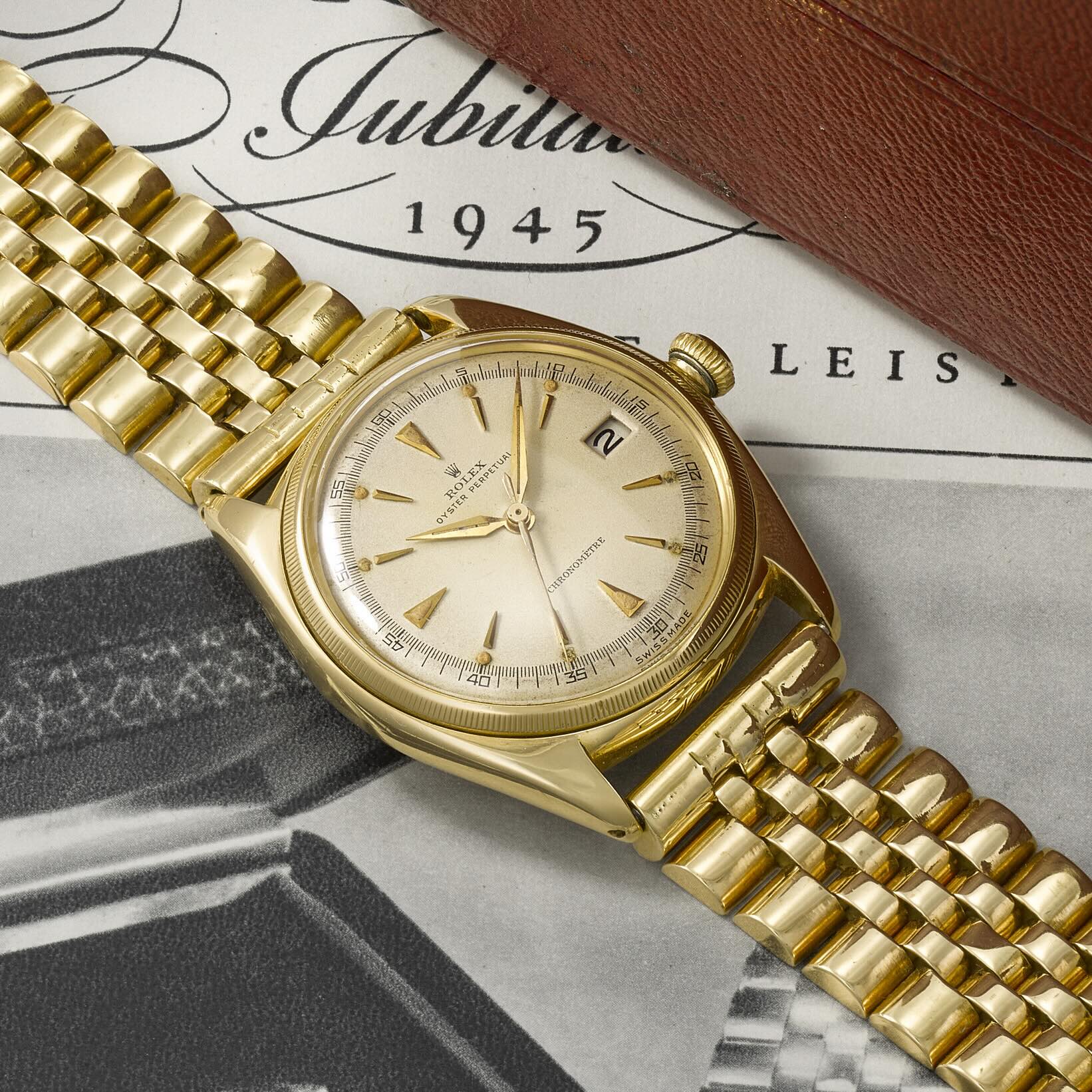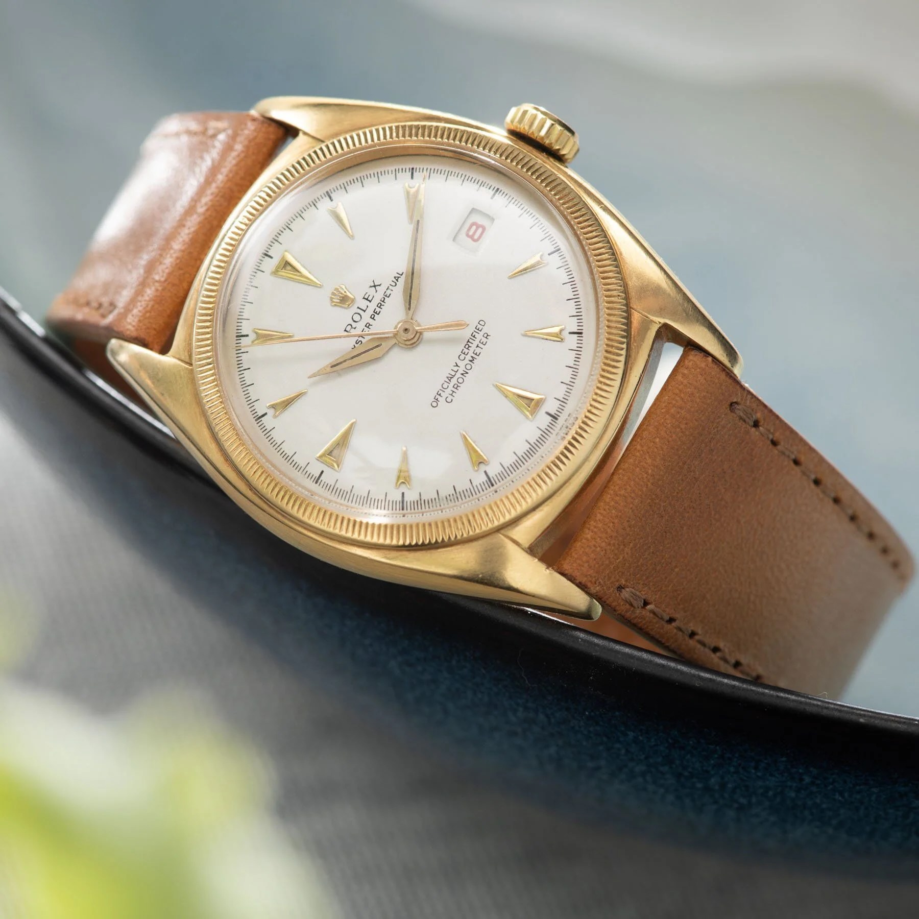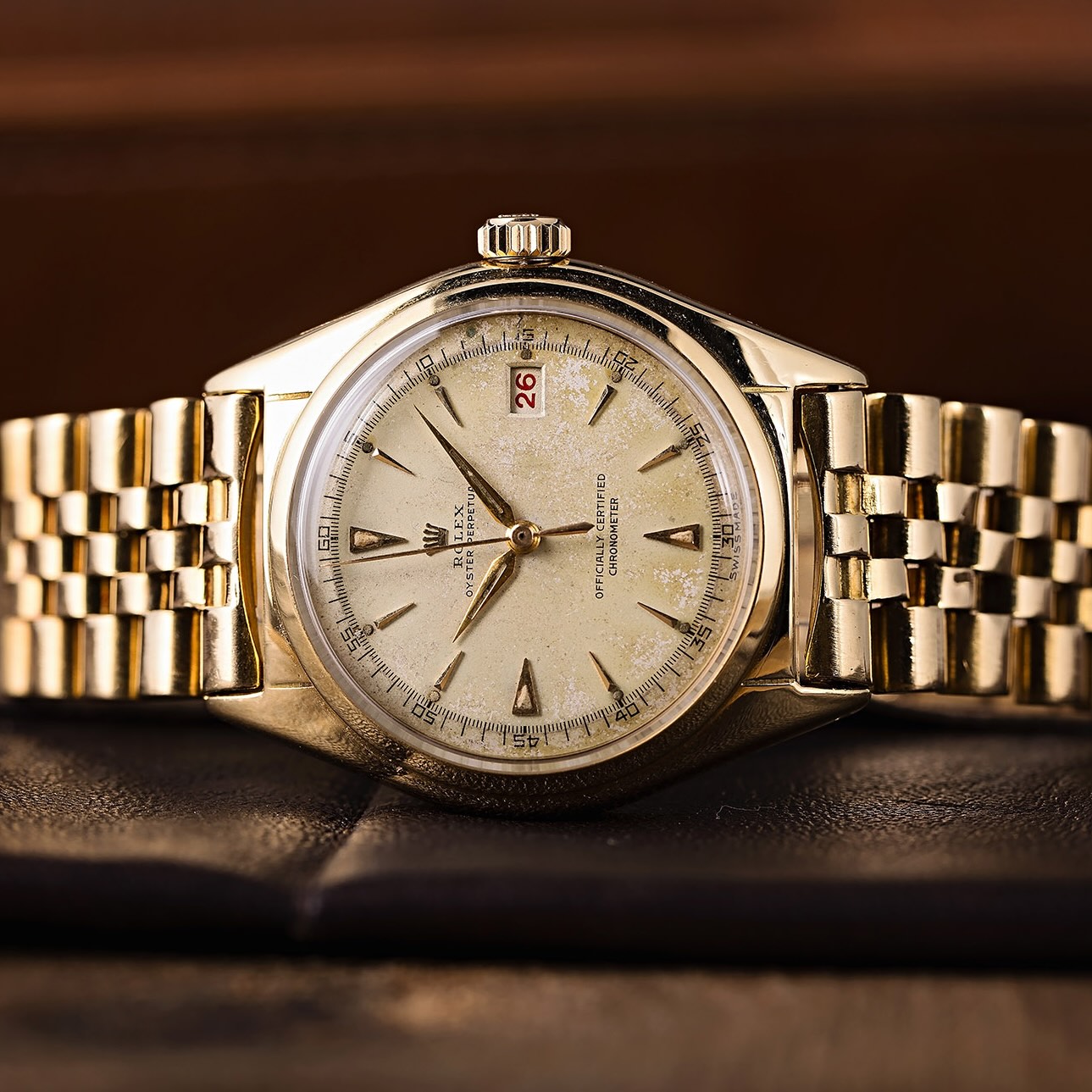 The Datejust again marked the 40th anniversary of Rolex with a 36mm, 18k yellow gold Oyster case, coin-edge fluted bezel and date window at 3 o’clock (without cyclops lens). It also introduced the five-piece Jubilee bracelet (as the word jubilee represents a special anniversary), and although not in its final form, the Datejust formula took the industry by storm as it was the first automatic wristwatch with a date window that automatically changed. The relatively large calibre 710 necessitated a domed or “Big Bubbleback” case back, which was larger and more bulbous than the common Bubbleback Rolex models at the time. It even earned the nickname “Ovettone” (Italian for big egg) as the case back with a domed crystal kind of resembled an egg, at least to some. The off-white dial featured applied gold pointed dagger indices with radium dots and gold alpha hands with radium inserts (safer tritium wasn’t a thing yet). A detailed minute/seconds track with Arabic numerals spanned the outermost perimeter and the bevelled date window sat at 3 o’clock with black print – a position that became a general industry standard moving forward. “Datejust” wasn’t printed on the dial, as “Chronometre” appeared above 6 o’clock instead, while Rolex and Oyster Perpetual were printed below 12 o’clock with a printed coronet. It would be nine years before the first “Datejust” dials debuted around 1954 with ref. 6105, but Datejust still described the watch in advertisements and catalogues. That said, a relative handful of dials starting around 1950 with ref. 5030/5031 had Datejust, but it was far from the norm. Later ref. 4467 dials had “Certified Chronometer” above 6 o’clock.