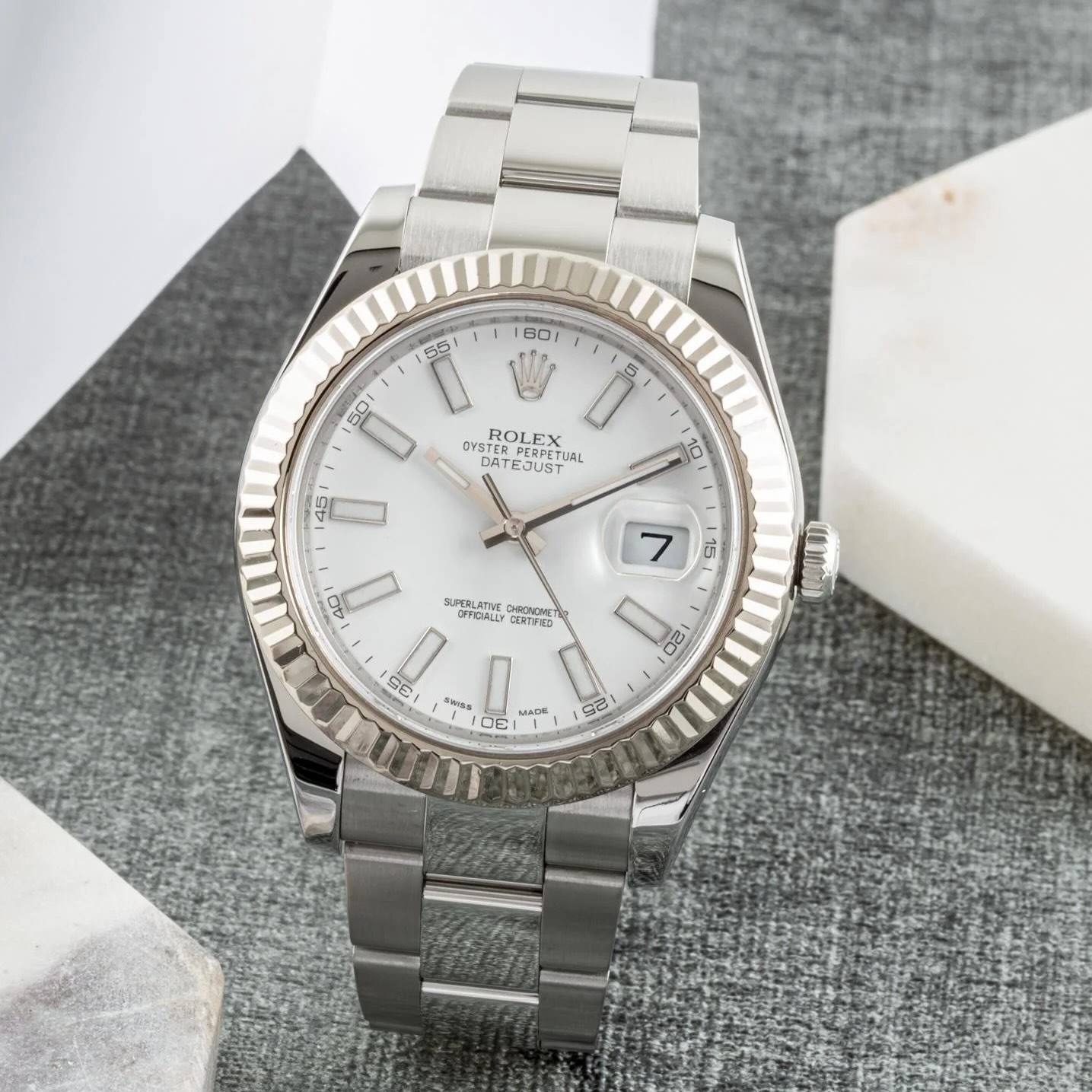 Arguably the biggest change to the Datejust design happened in 2009 with the Datejust II, the first model to go from 36mm to 41mm – a very big deal and polarising at the time for such a conservative watchmaker that holds onto tradition and generally resists this kind of change. The case didn’t just get bigger, but bolder as well. The lugs and bezel were now thicker and wider in proportion to the case (compared to the 36mm models), following an industry trend and targeting buyers who wanted larger watches. 36mm watch cases are definitely on the smaller side of men’s watches today, reflecting how tastes have changed in recent decades. The new model brought a new movement, calibre 3136, although changes were relatively minor compared to the previous calibre 3135. Ref. 116300 was the stainless steel model with a smooth bezel, while ref. 116334 was the steel model with a white gold fluted bezel. Interestingly, The Datejust II only came with an Oyster bracelet despite the fluted bezel that traditionally pairs with a Jubilee. This was likely due to the simplicity of production for the larger case (and cost savings). Many other references/options existed within the Datejust II collection, including dial variances and metals.