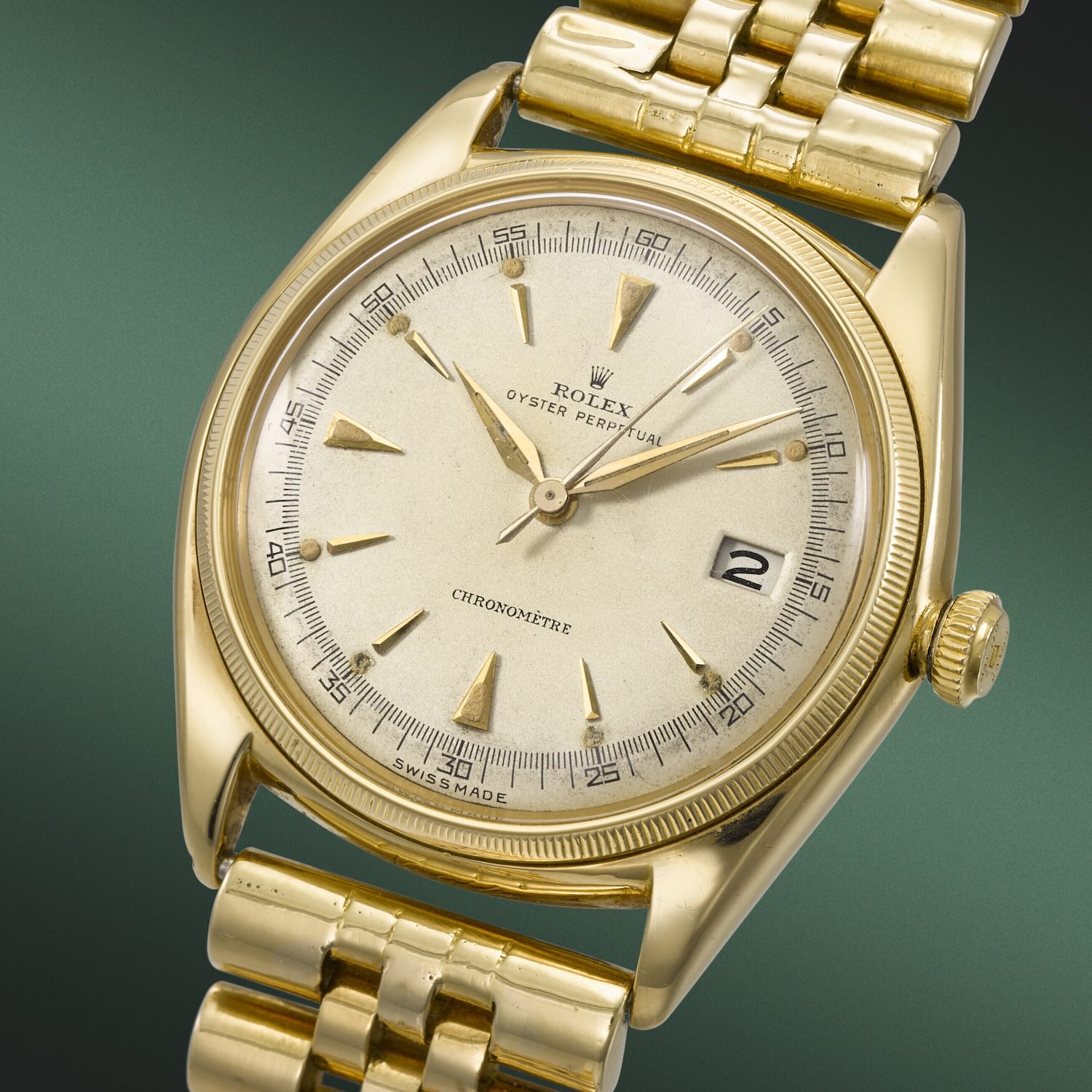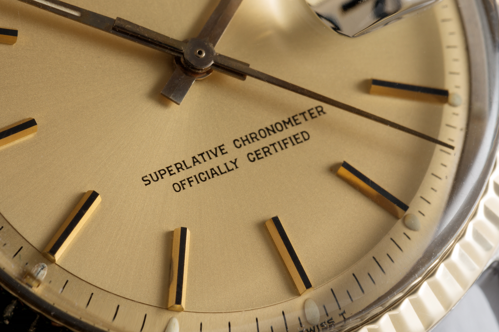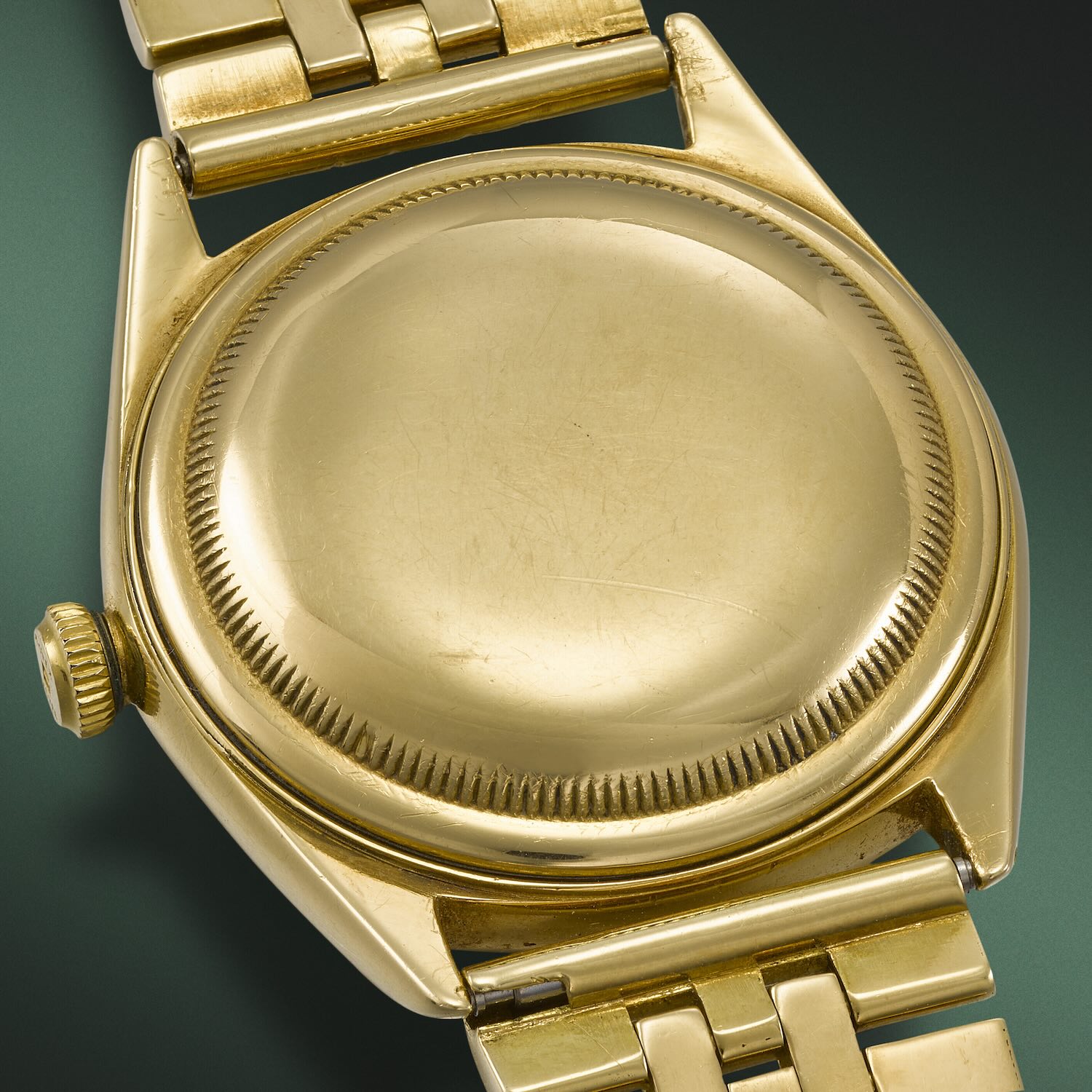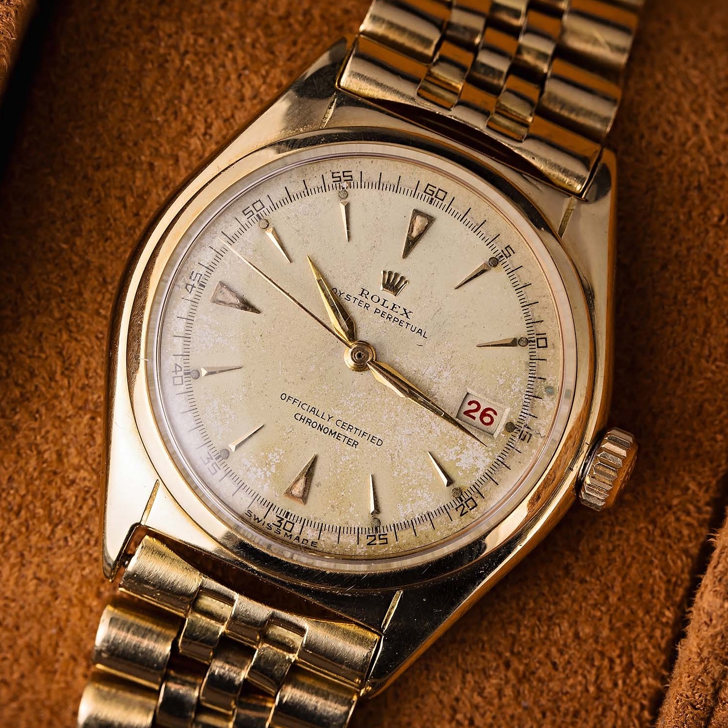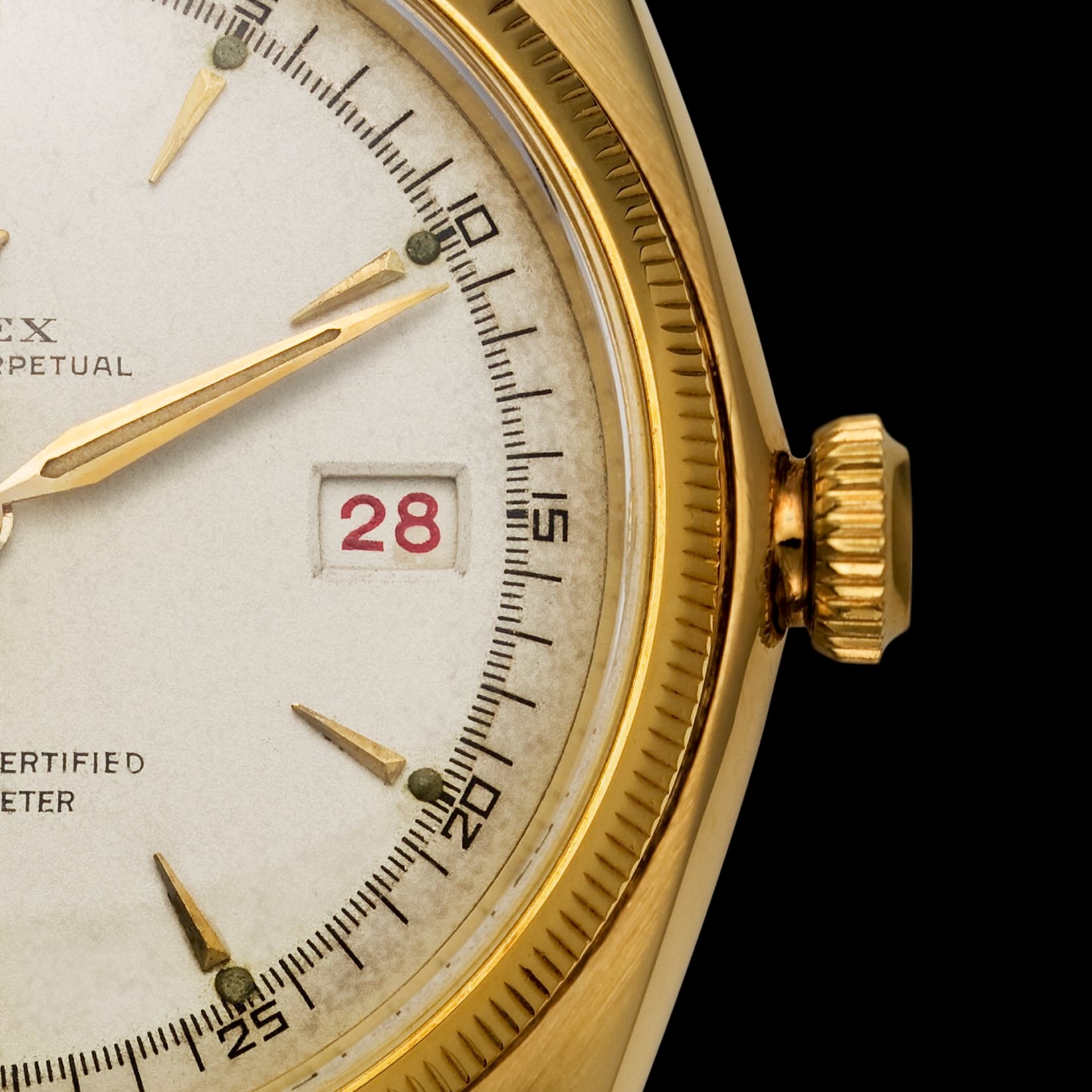 The Datejust again marked the 40th anniversary of Rolex with a 36mm, 18k yellow gold Oyster case, coin-edge fluted bezel and date window at 3 o’clock (without cyclops lens). It also introduced the five-piece Jubilee bracelet (as the word jubilee represents a special anniversary), and although not in its final form, the Datejust formula took the industry by storm as it was the first automatic wristwatch with a date window that automatically changed. The relatively large calibre 710 necessitated a domed or “Big Bubbleback” case back, which was larger and more bulbous than the common Bubbleback Rolex models at the time. It even earned the nickname “Ovettone” (Italian for big egg) as the case back with a domed crystal kind of resembled an egg, at least to some. The off-white dial featured applied gold pointed dagger indices with radium dots and gold alpha hands with radium inserts (safer tritium wasn’t a thing yet). A detailed minute/seconds track with Arabic numerals spanned the outermost perimeter and the bevelled date window sat at 3 o’clock with black print – a position that became a general industry standard moving forward. “Datejust” wasn’t printed on the dial, as “Chronometre” appeared above 6 o’clock instead, while Rolex and Oyster Perpetual were printed below 12 o’clock with a printed coronet. It would be nine years before the first “Datejust” dials debuted around 1954 with ref. 6105, but Datejust still described the watch in advertisements and catalogues. That said, a relative handful of dials starting around 1950 with ref. 5030/5031 had Datejust, but it was far from the norm. Later ref. 4467 dials had “Certified Chronometer” above 6 o’clock.