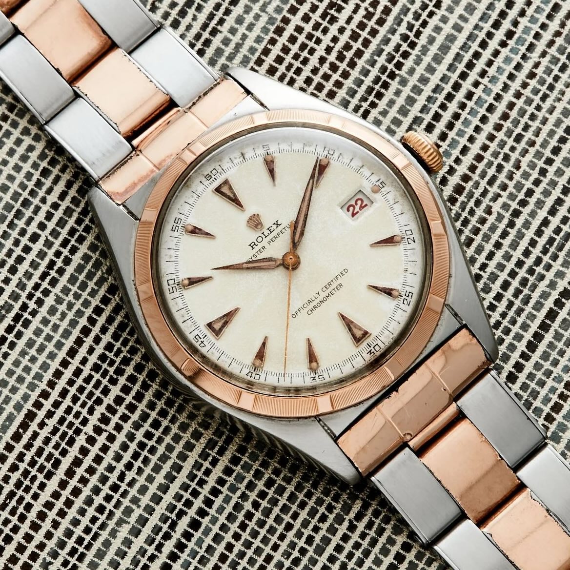 The next major references, 5030 and 5031, were transitional models that introduced some new elements, but remained true to the early ref. 4467 aesthetic. They continued with the “Ovettone” nickname as the Big Bubbleback case back and domed crystal persisted, but a new Rolesor design (gold and steel combo) and all steel option brought a more casual vibe and distinctive look that would really define later models. Ref. 5030 introduced a smooth bezel, while ref. 5031 had an engine turned bezel, but they were otherwise the same. White and black dials were standard and the roulette date wheels were mostly used, and cases were available with yellow or rose gold, two-tone Rolesor and steel. Interestingly, there were three distinctive coronets seen in these references – basically short or tall. As mentioned, these were the first models to have Datejust appear in limited numbers.