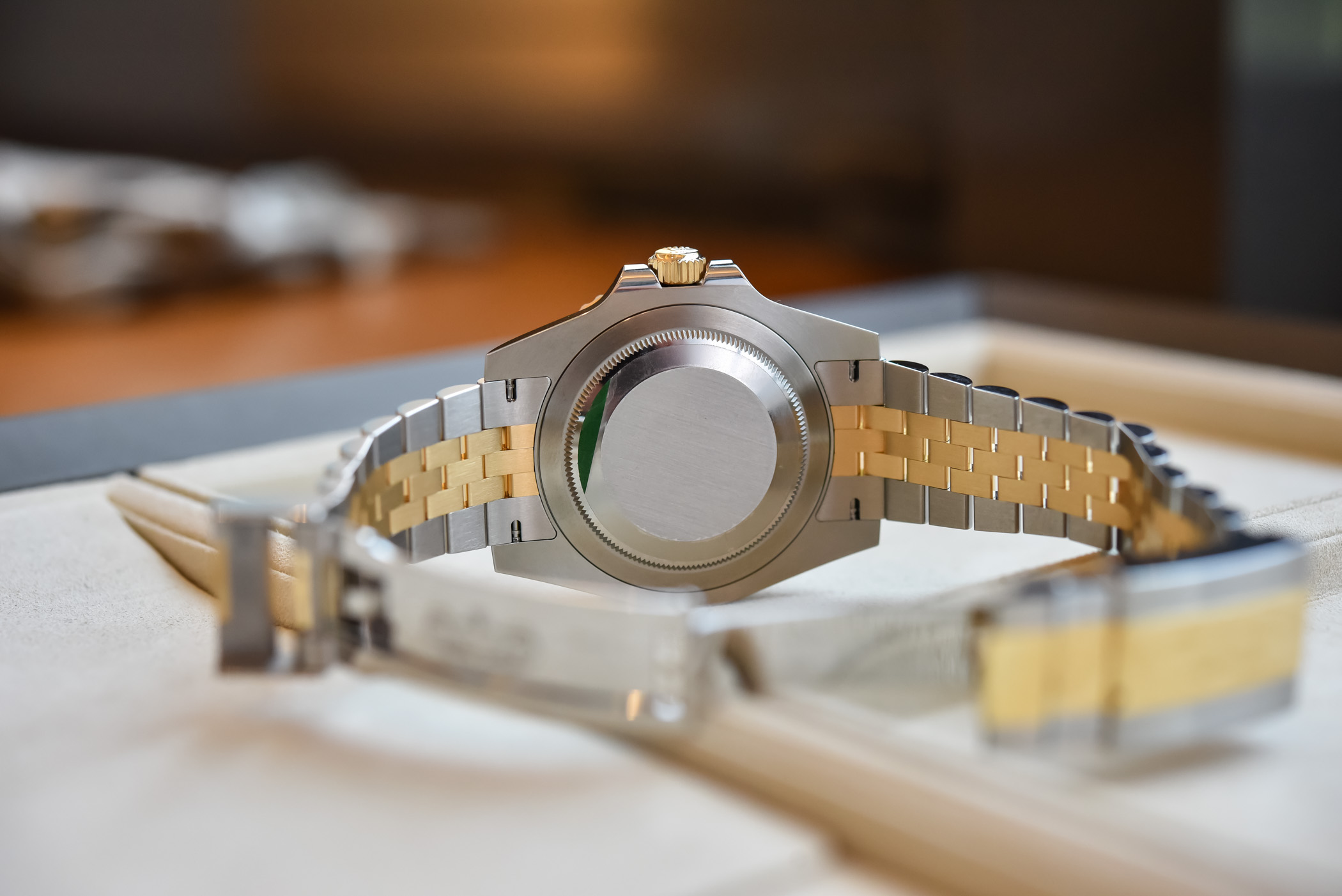Before I go up close and personal with the 126713GRNR (reference numbers are going more and more complex at Rolex…) we first need to recap the facts, and look at this new two-tone steel and yellow gold GMT-Master II for what it is. First of all, next to the full yellow gold version (reference 126718GRNR), this new model marks the return of yellow gold in the collection. Indeed, since the discontinuation of the solid yellow gold models – 116718LN green or black dial – and the two-tone yellow Rolesor – 116713LN – a few years ago, your only option for precious metal GMTs were Everose (solid or matched with steel), or white gold. And, also important, they all come on an Oyster bracelet.