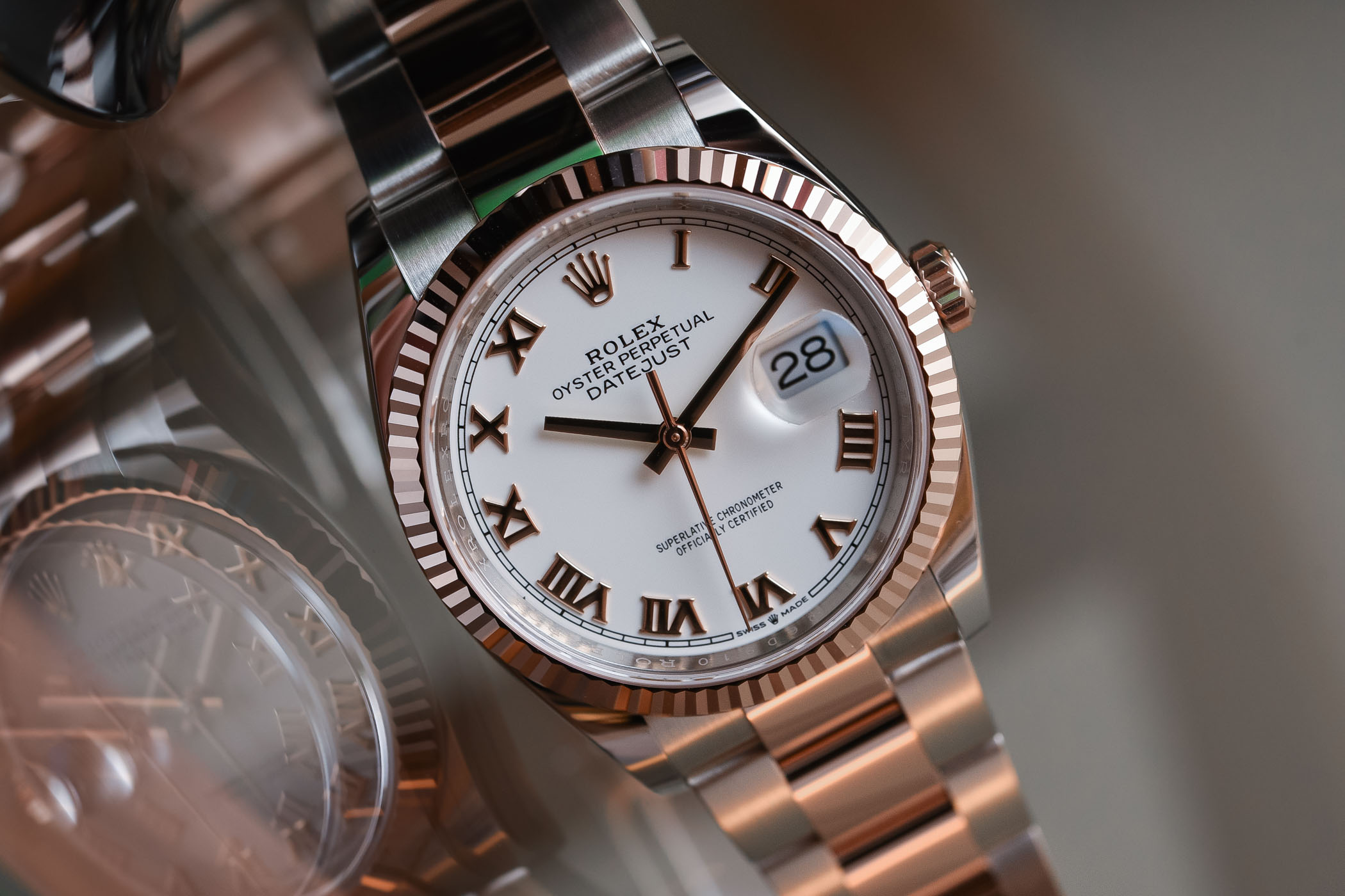 As the first automatic waterproof chronometer wristwatch to display the date in a window at 3 o’clock on the dial, the Datejust has been going strong since its launch in 1945. The model we are looking at here is a Rolesor, the term Rolex gives to watches that combine gold and steel. First introduced on the Datejust model in 1948, Rolesor offers a strategic alliance of luxury and resilience that are quintessential features of the brand and has contributed to the legendary status of this classic watch. This Datejust 36 model features 18k Everose gold on the fluted bezel, the crown and polished central bracelet links, while the case and outer links are crafted in hyper-resilient Oystersteel (the new name for the 904L steel).