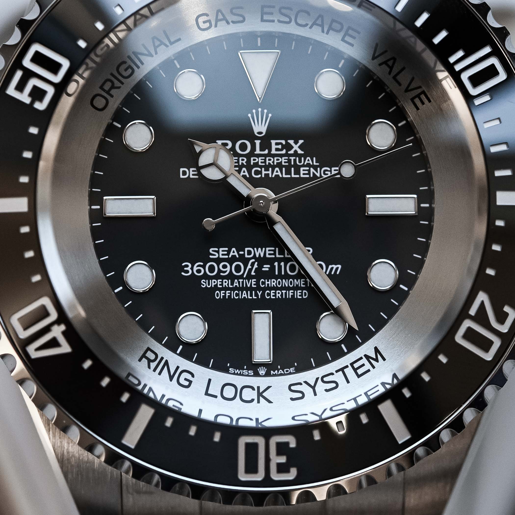 How is it possible to create a watch that can withstand about 1100 bars or 13 tons of pressure? Well, it’s the combination of multiple elements, starting with a well-secured crown and high-resistance gaskets, in this case, a Triplock crown. Then, it’s mostly the Ringlock system that does the job. Patented in 2007, Ringlock consists of a compression ring that absorbs most of the stress due to the pressure and reduces the stress on the case. This compression ring made of BioDur 108 (an alloy used in orthopaedic implants) can withstand three times as much stress as Oystersteel (or 904L steel). It is positioned between the crystal and the titanium back, diverting most of the stress on its extra-tough structure. With it, the case can be made thinner and so does the crystal (relatively speaking, of course).